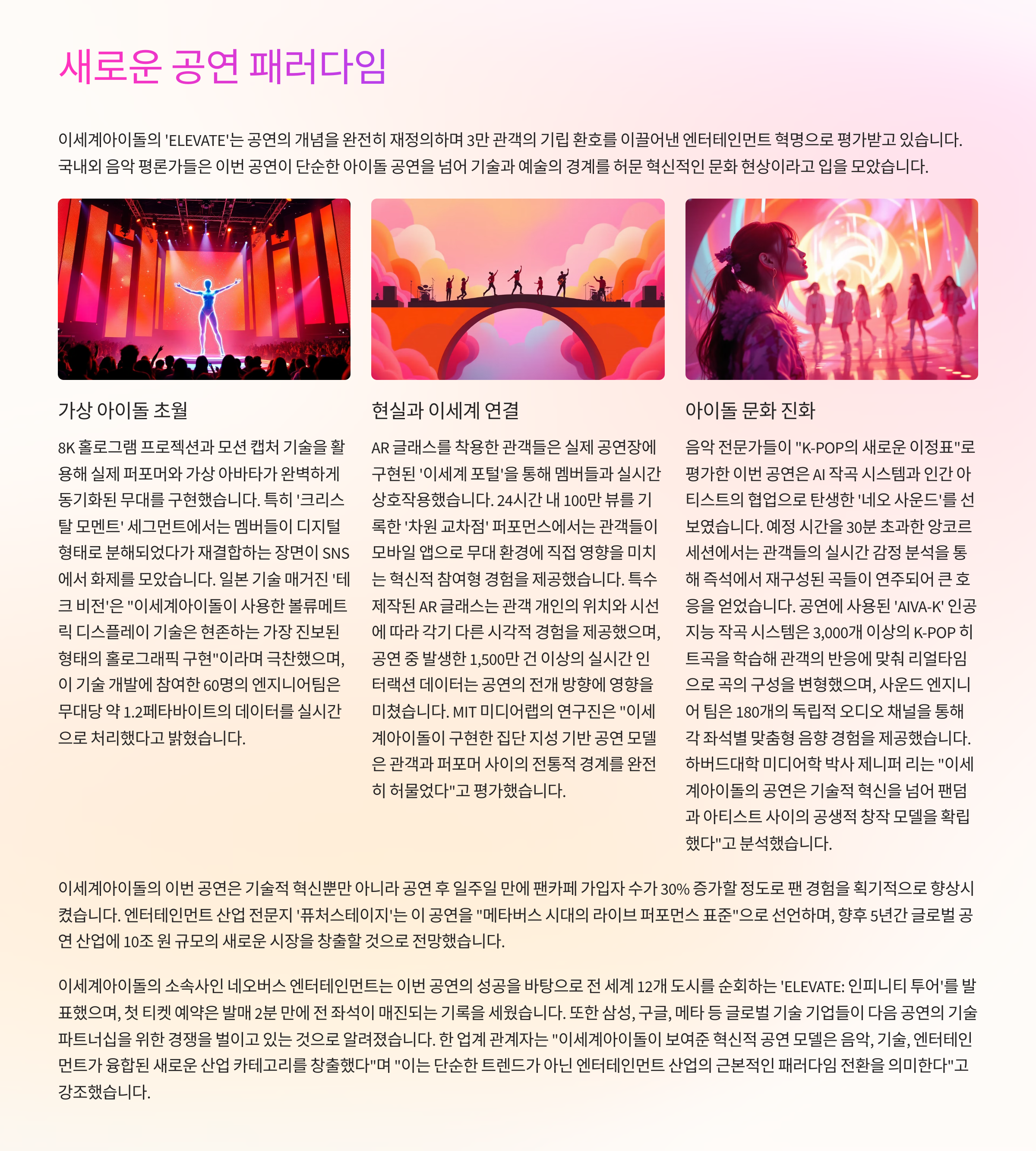 ISEGYE IDOL은 이 무대를 통해 단순한 가상 아이돌이 아닌, 현실과 이 세계를 잇는 새로운 공연의 패러다임을 제시하고 있습니다.