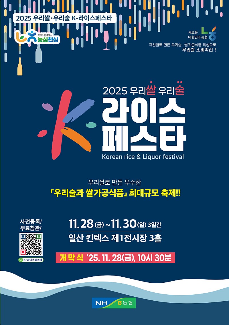 2025년 11월 28일부터 30일까지 경기도 일산 킨텍스에서는 **'2025 우리 쌀·우리 술 K-라이스페스타'**가 성대하게 개최됩니다. 이 행사는 농협경제지주가 주최·주관하며, 대한민국 쌀 소비를 촉진하고 우리 쌀의 우수성을 전 세계에 알리기 위해 기획된 국가급 프로젝트입니다.
