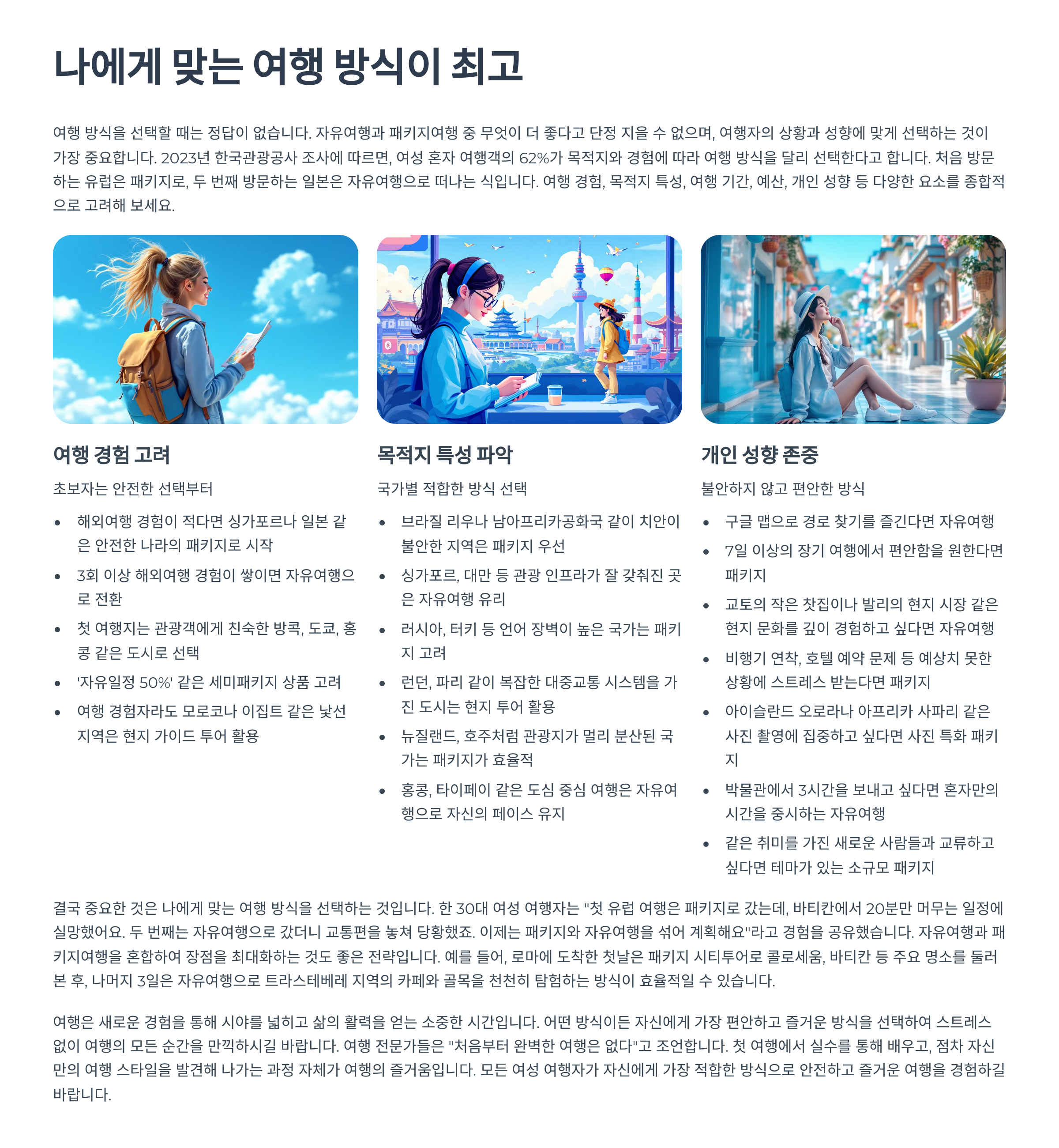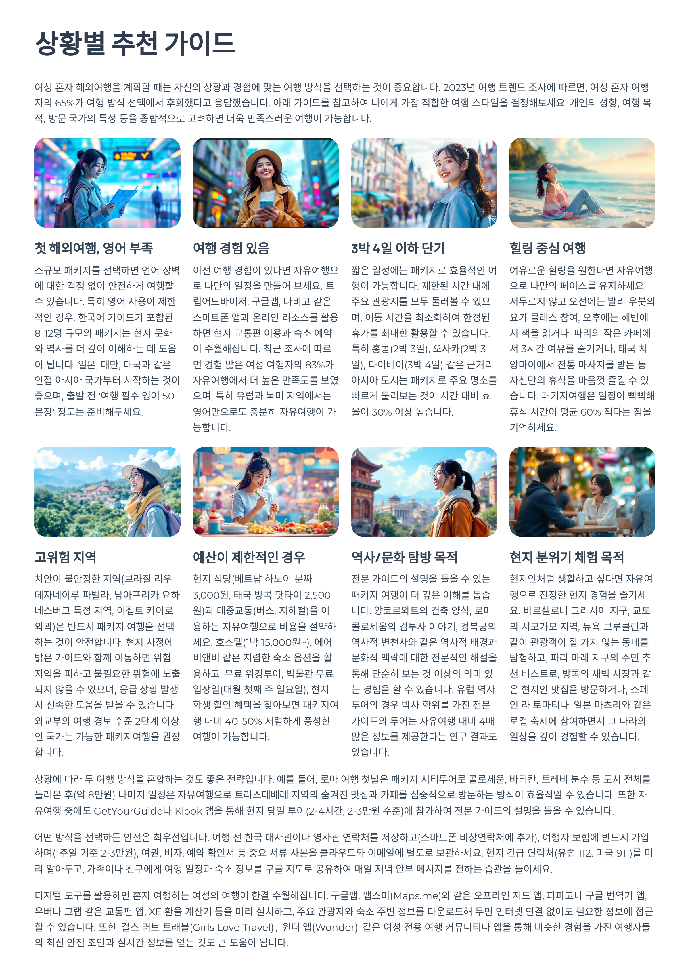 자유여행과 패키지는 모두 매력적인 방식이지만, 여성 혼자여행자라면 자신의 상황과 목적에 맞게 선택하는 것이 중요합니다. 아래는 대표적인 여행 상황별 추천 방식입니다.