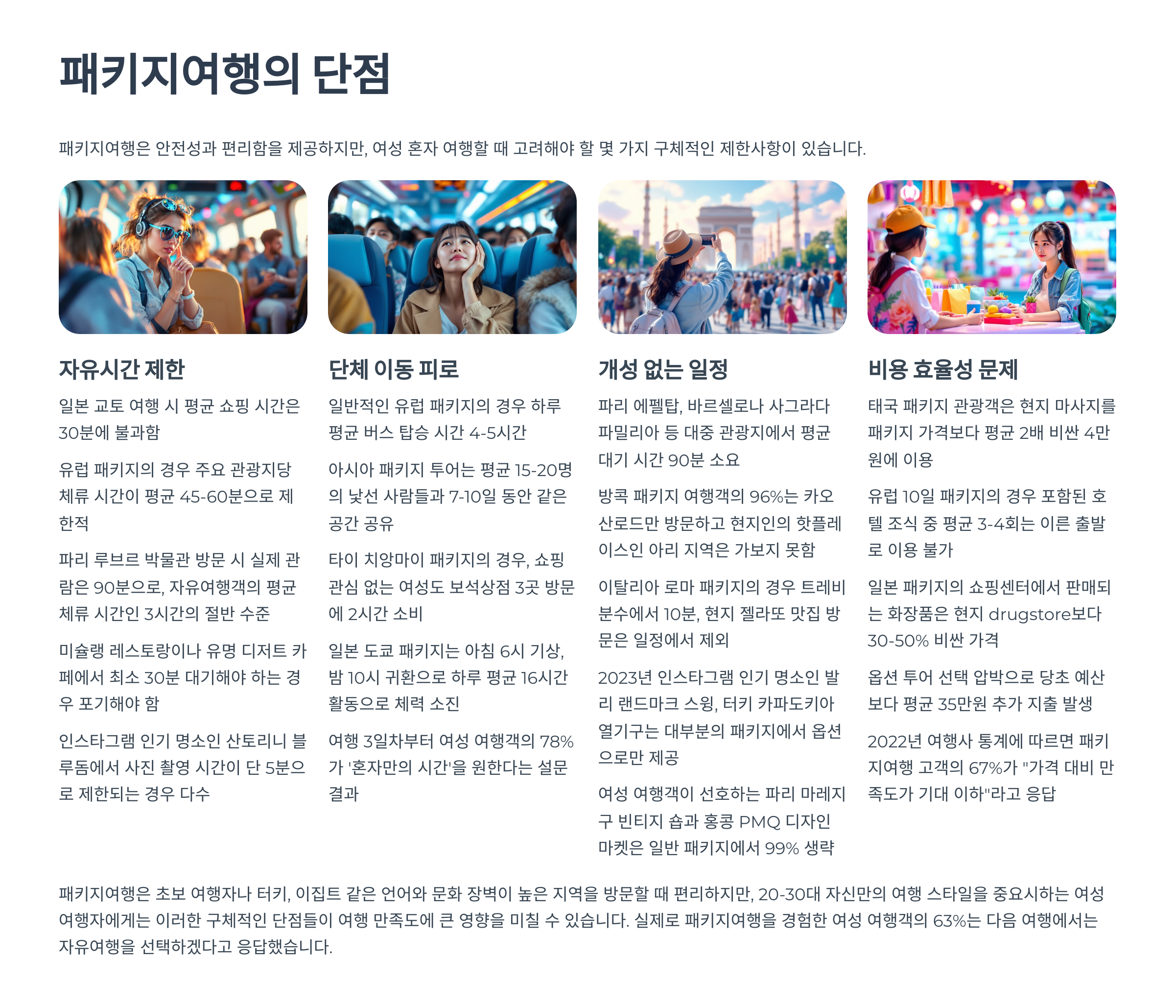 이 글에서는 여성 혼자여행자 관점에서 자유여행과 패키지여행을 철저히 비교하고, 상황별 추천 전략까지 안내드립니다.
