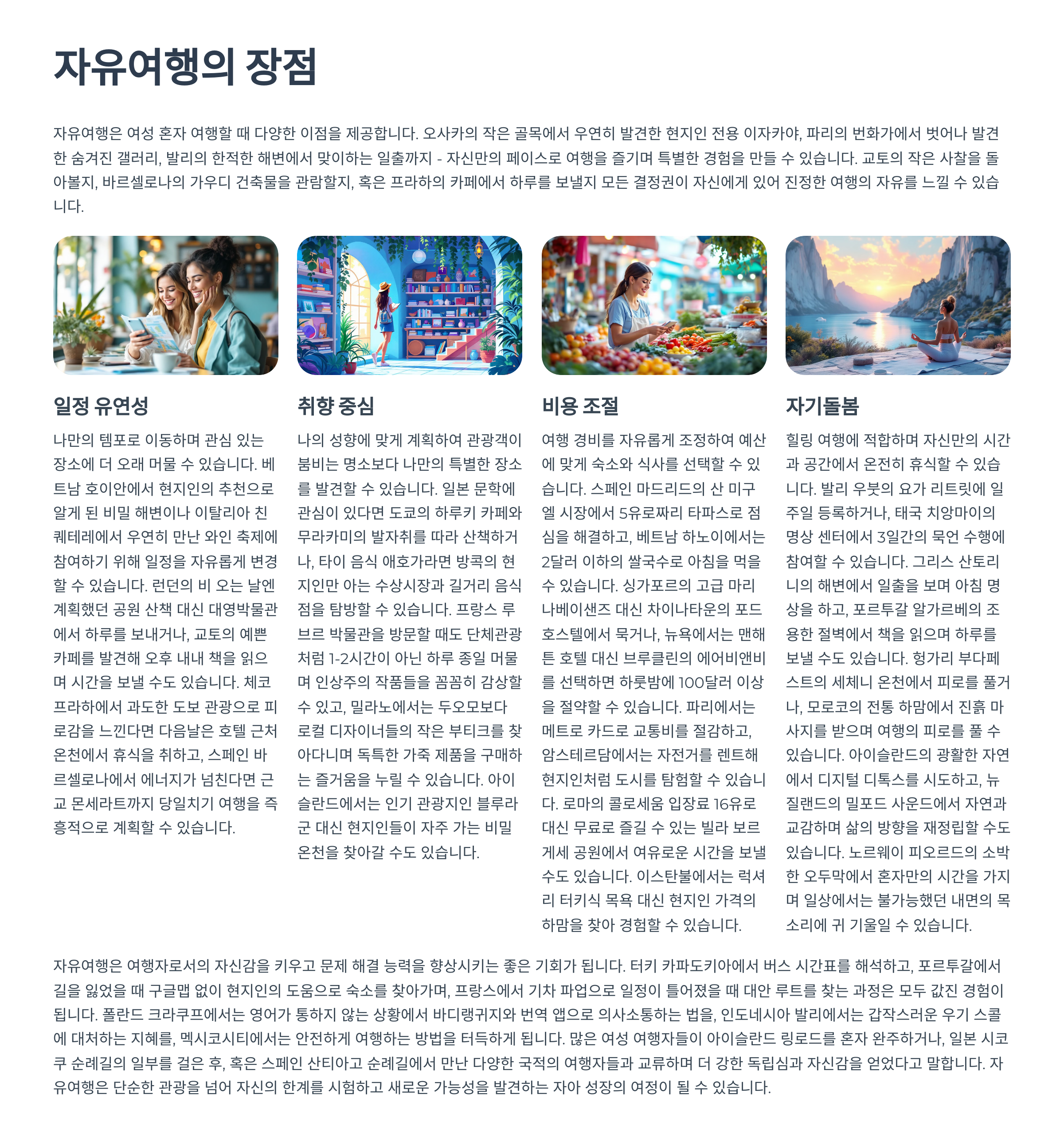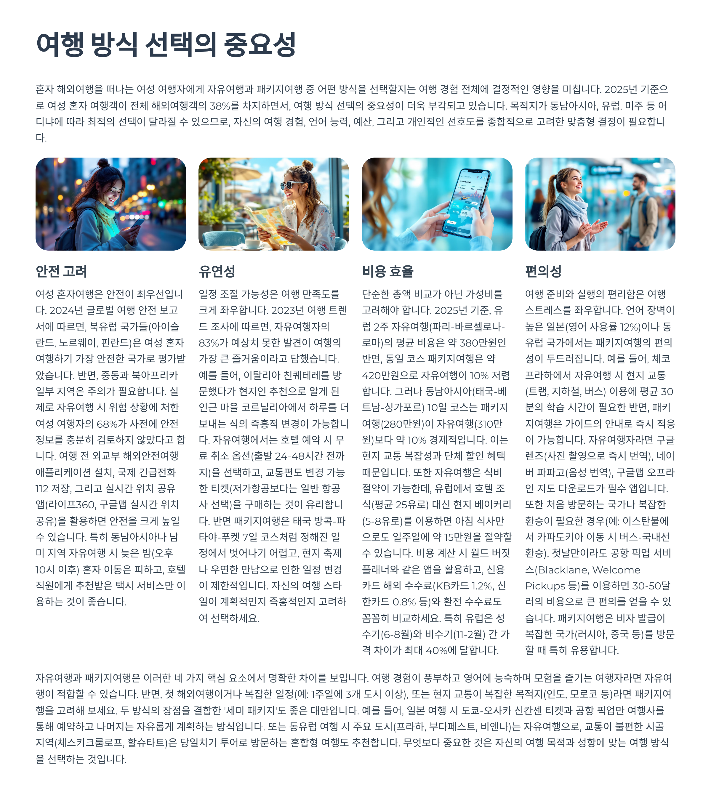 특히 여성 혼자여행은 안전, 유연성, 비용, 편의성 등 여러 요소를 고려해야 하기에 신중한 비교가 필요합니다.