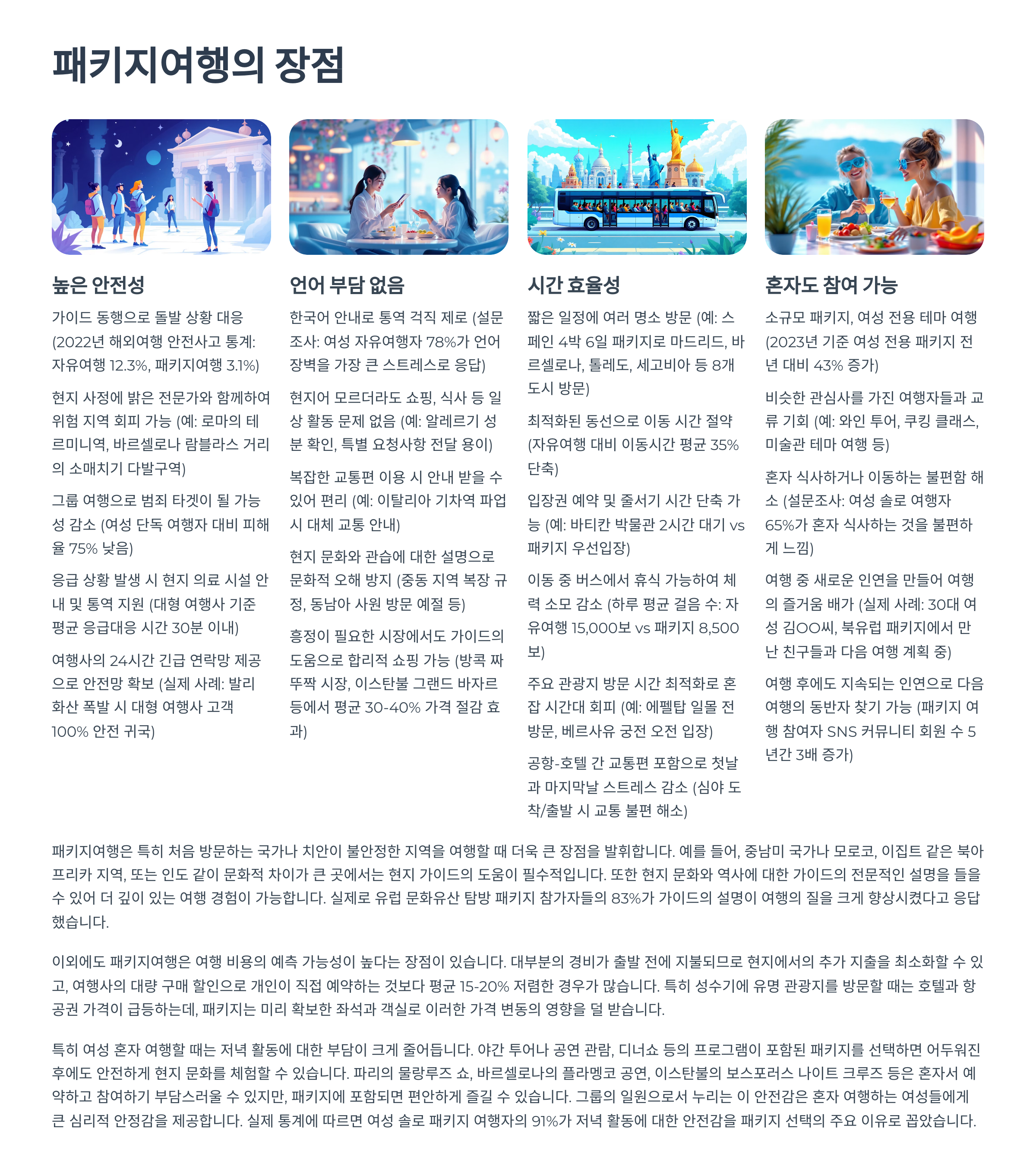 패키지여행은 여행사가 일정 전체를 설계하고, 가이드가 동행하며 항공, 숙소, 교통, 식사까지 포함된 여행 방식입니다. 여성 혼자여행자의 입장에서 패키지는 특히 낯선 국가에 대한 두려움을 덜고, 여행 준비 부담을 줄여주는 장점이 있습니다.