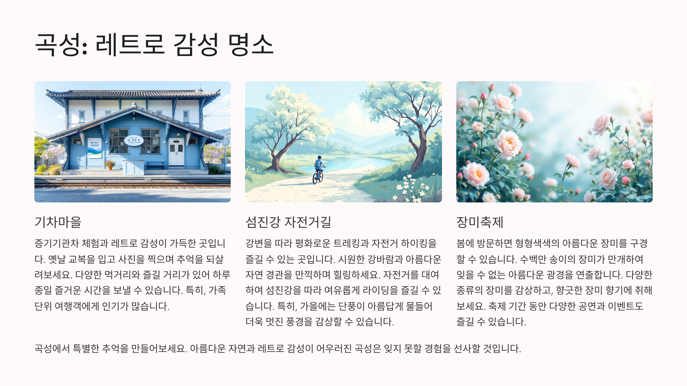 특히 봄에는 장미축제로도 유명하고요. 무엇보다 곡성의 매력은 ‘소박함’이에요.