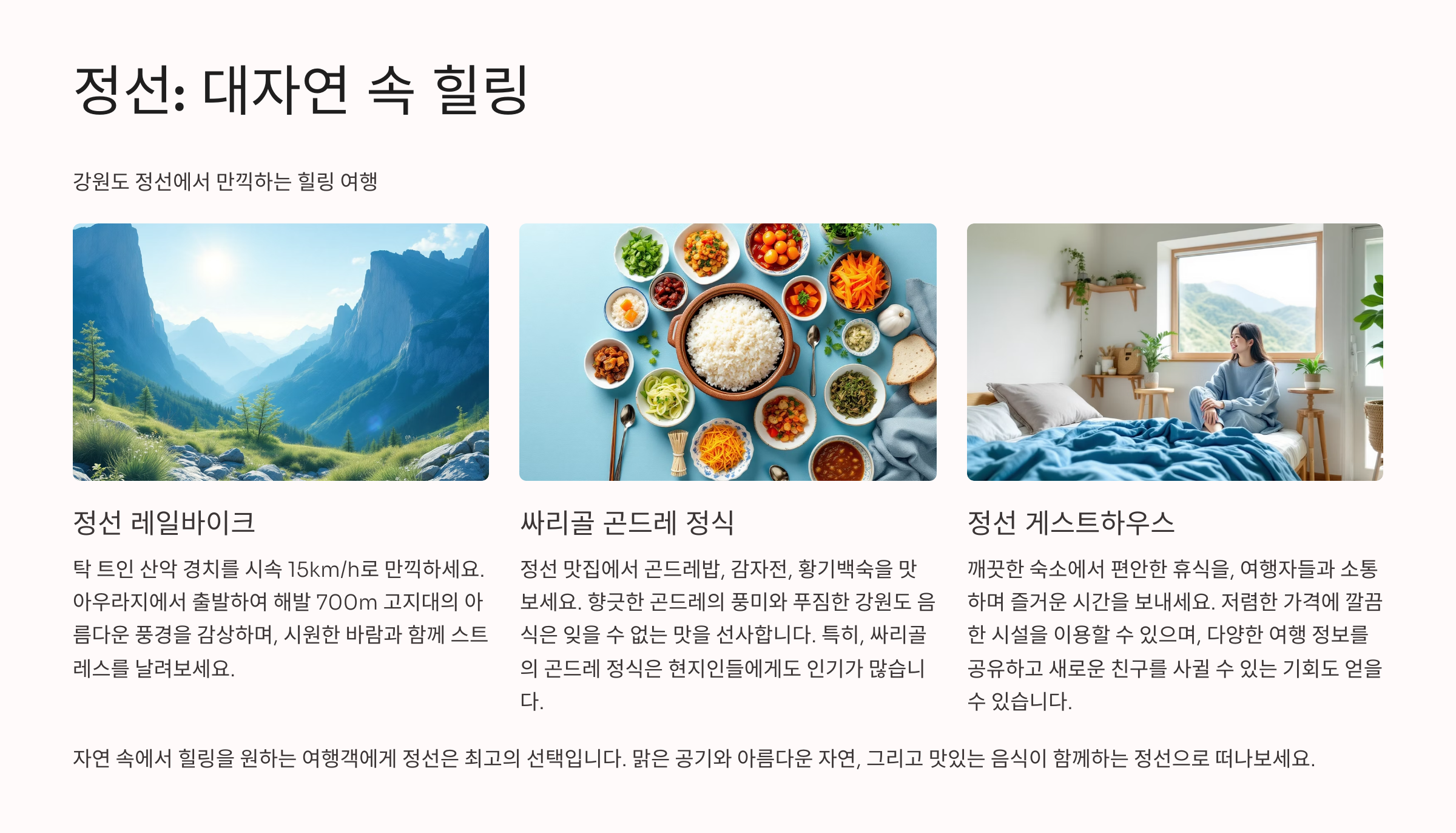 무엇보다 정선은 다른 관광지보다 숙박비, 식사비가 훨씬 저렴해서 하루 5만 원 이하로도 꽉 찬 여행이 가능해요.