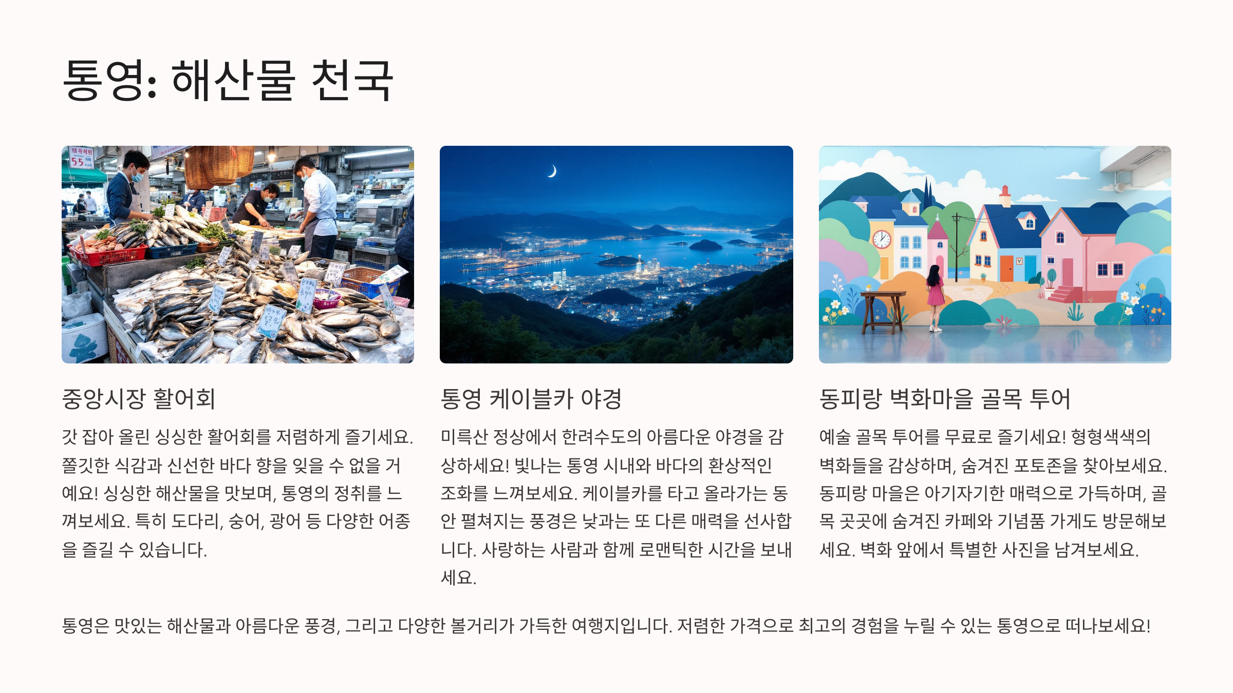특히 중앙시장에서는 1만원대 회 세트를 흔하게 볼 수 있고, 통영 케이블카에서 보는 한려수도의 절경은 정말 잊지 못할 추억이 됩니다. 가격은 착하고 뷰는 프리미엄이니까, 이보다 더한 가성비 여행지가 또 있을까요?
