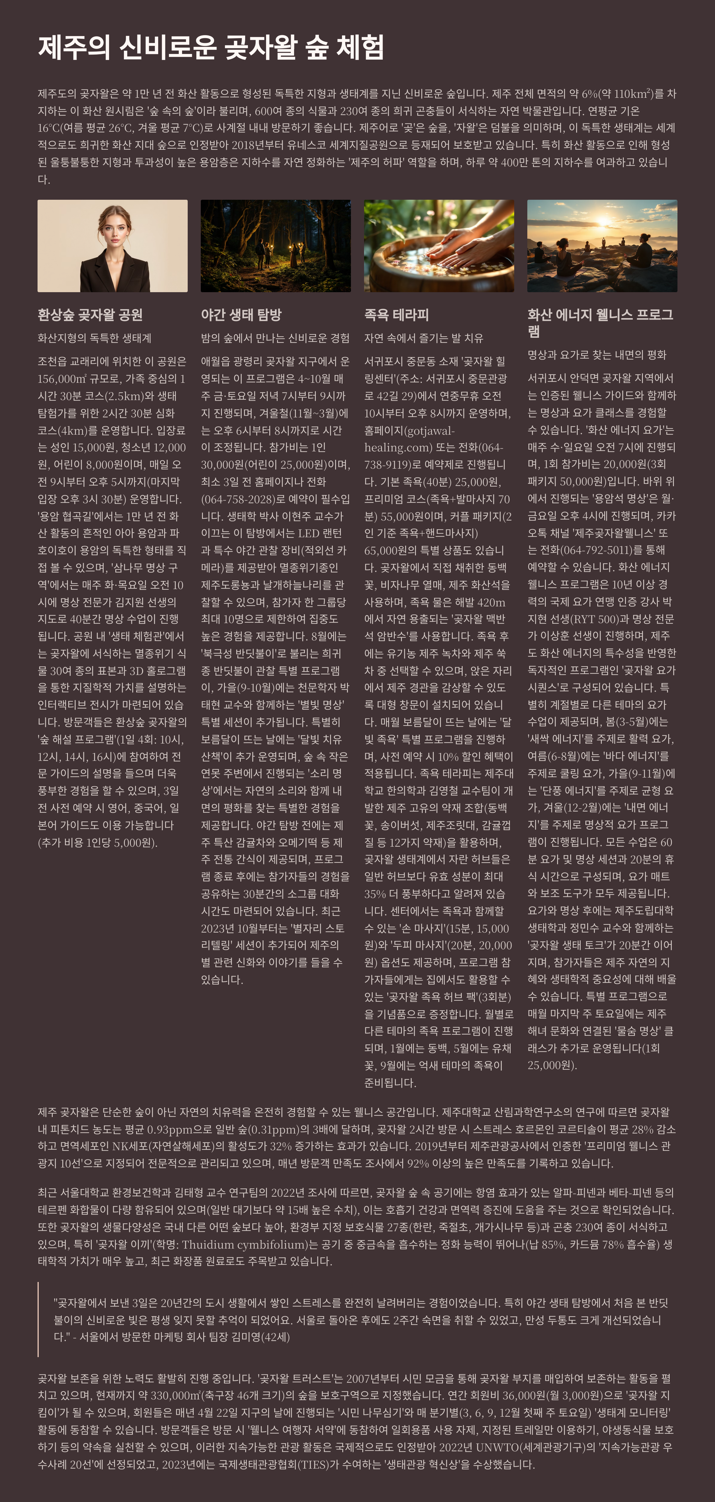 | 환상숲 곶자왈 공원 | 화산 숲, 독특한 생태계 | 숲 해설, 족욕 테라피, 야간 탐사 |