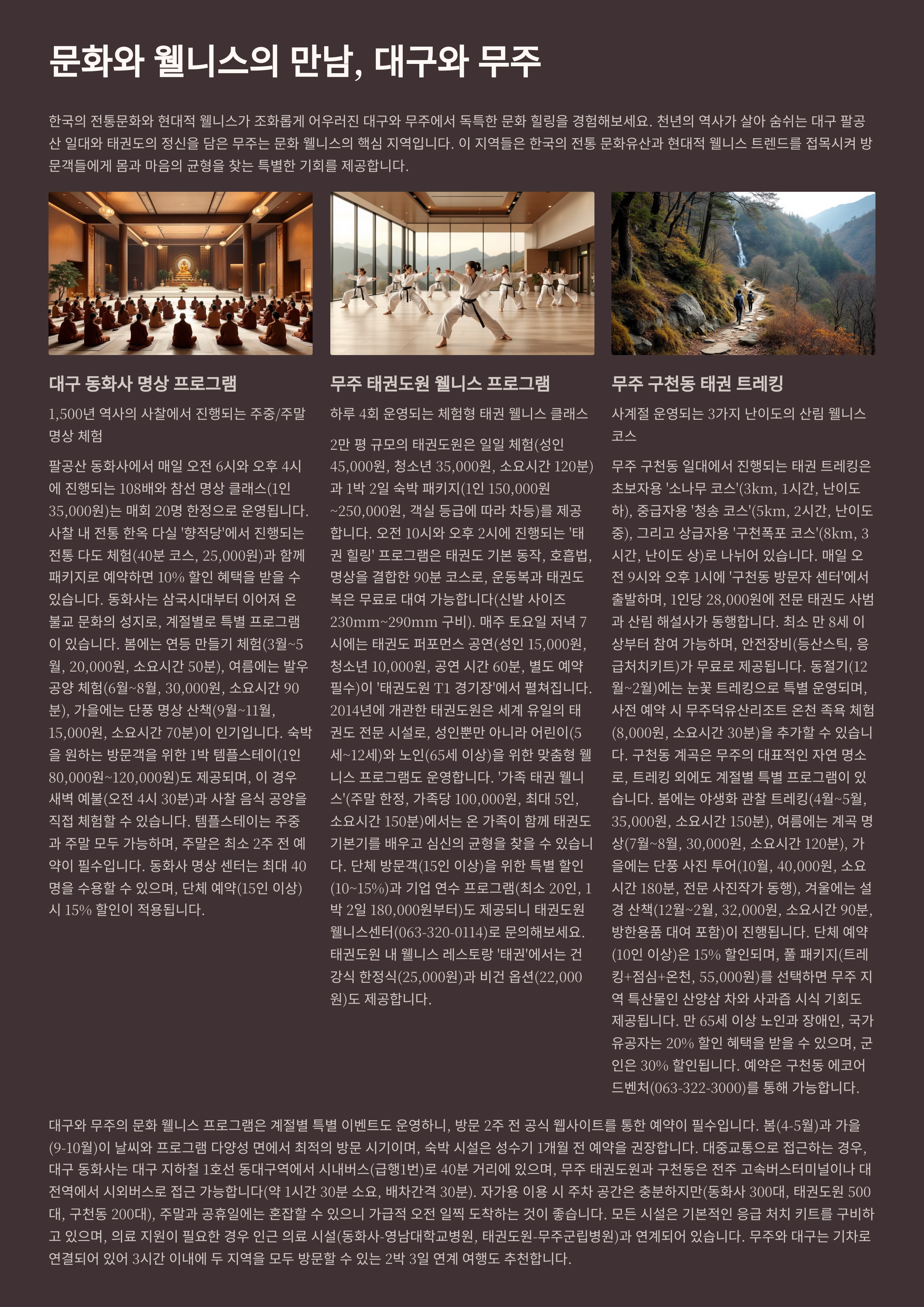 - 대구: 전통 건축 체험 + 명상 프로그램