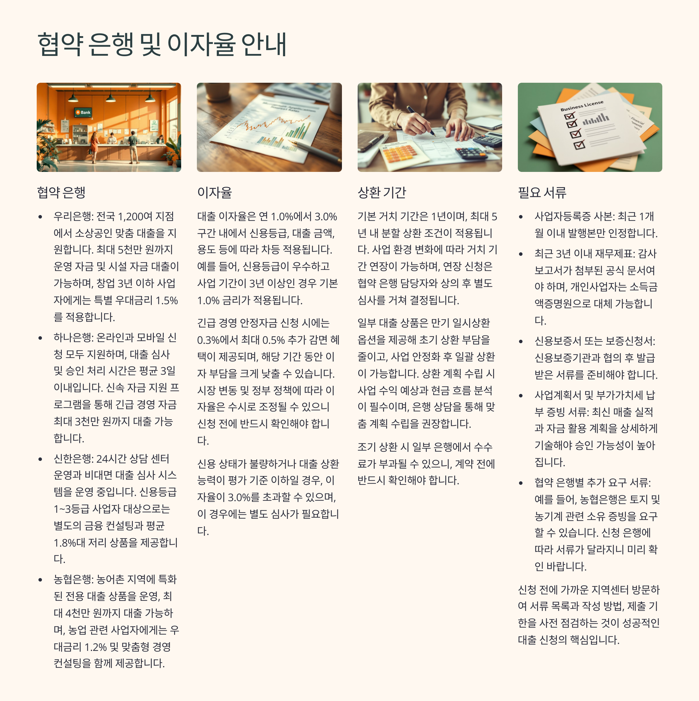 TIP: 대출 실행은 협약은행(우리, 하나, 신한, 농협 등)을 통해 이루어지며, 이자율은 연 1~3% 수준입니다.