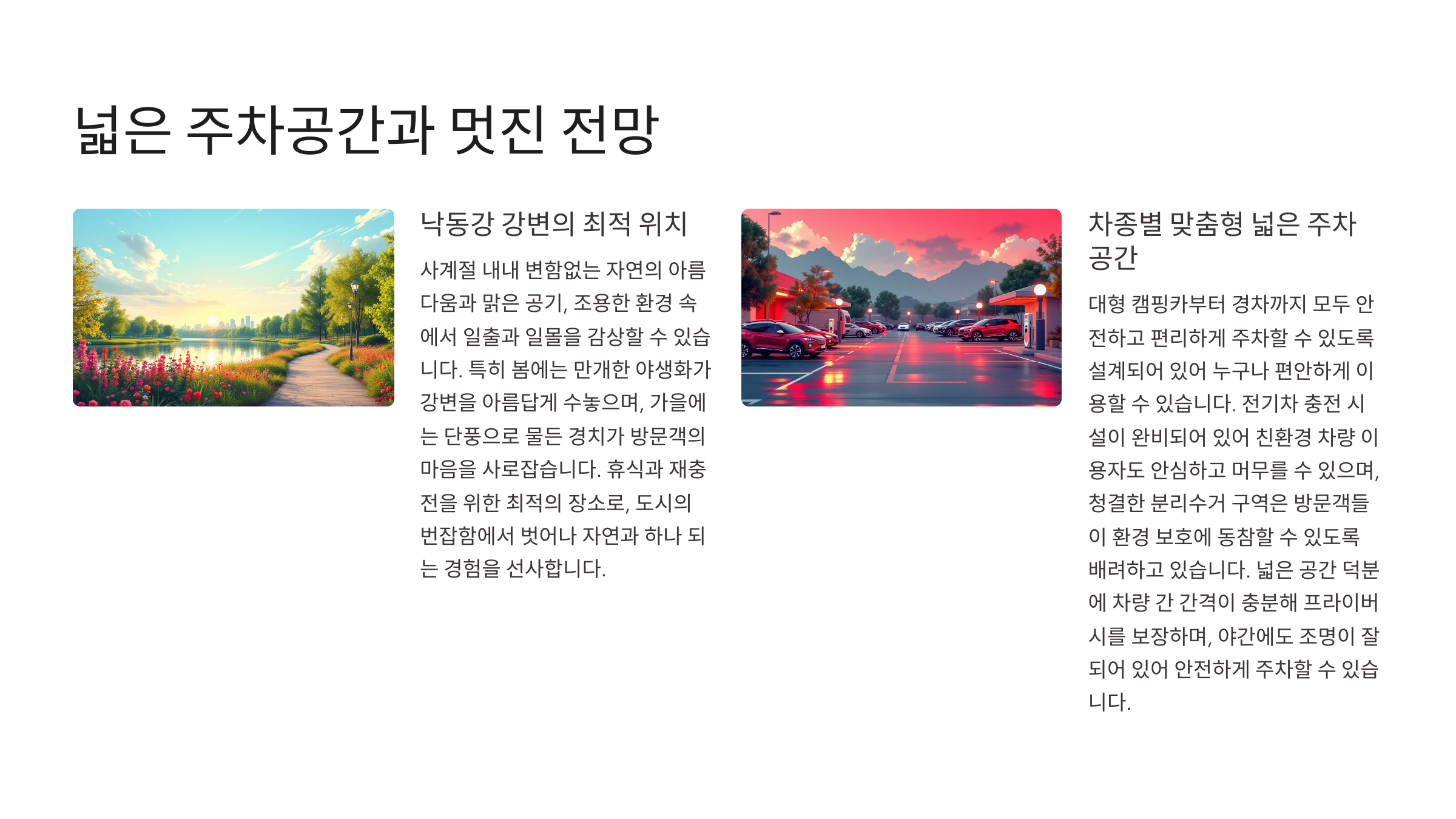 낙동강 강변에 위치해 있어 탁 트인 전망과 여유로운 공간을 제공합니다.