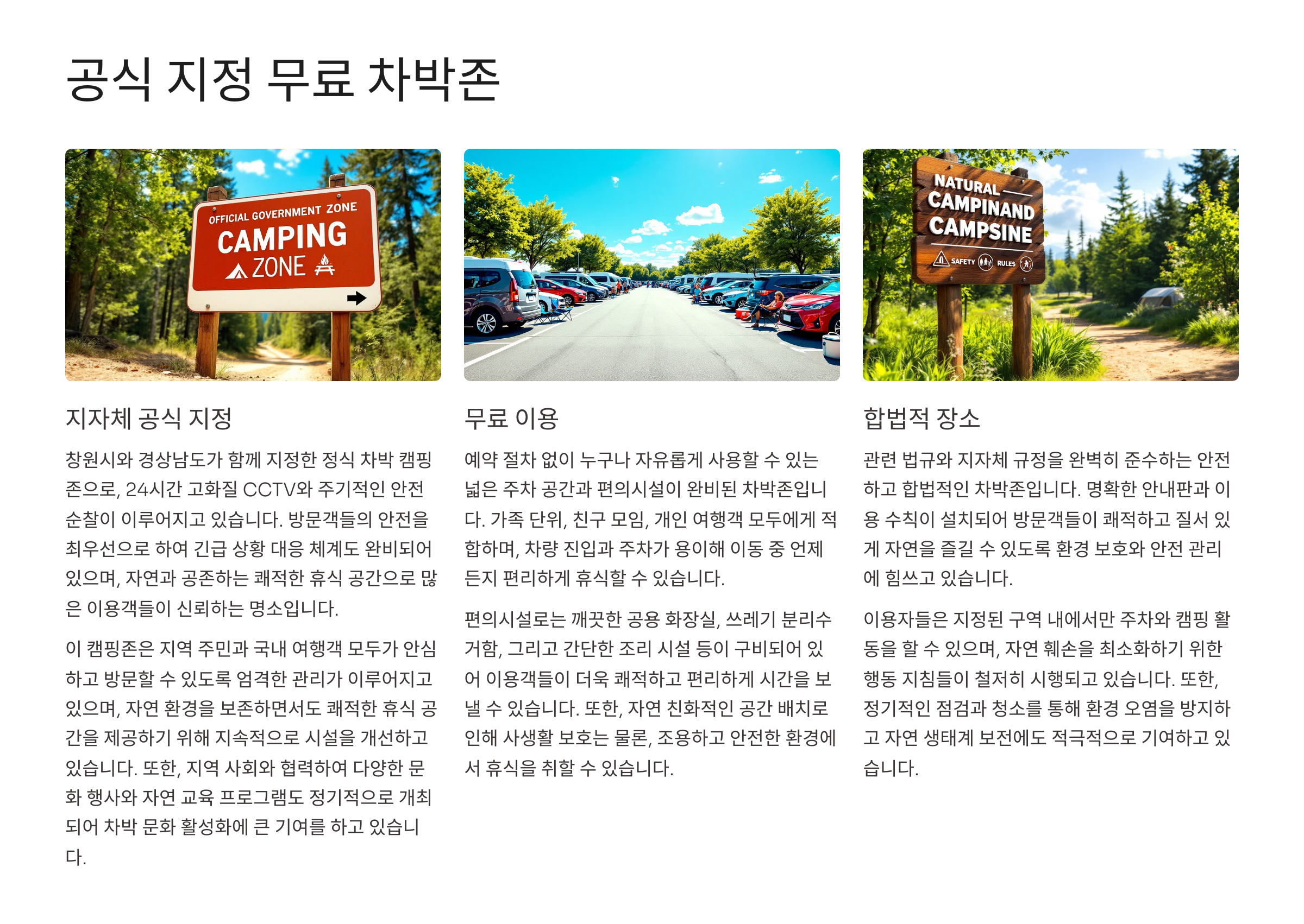 지자체에서 공식적으로 지정한 무료 차박존으로, 안심하고 이용할 수 있는 장소입니다.