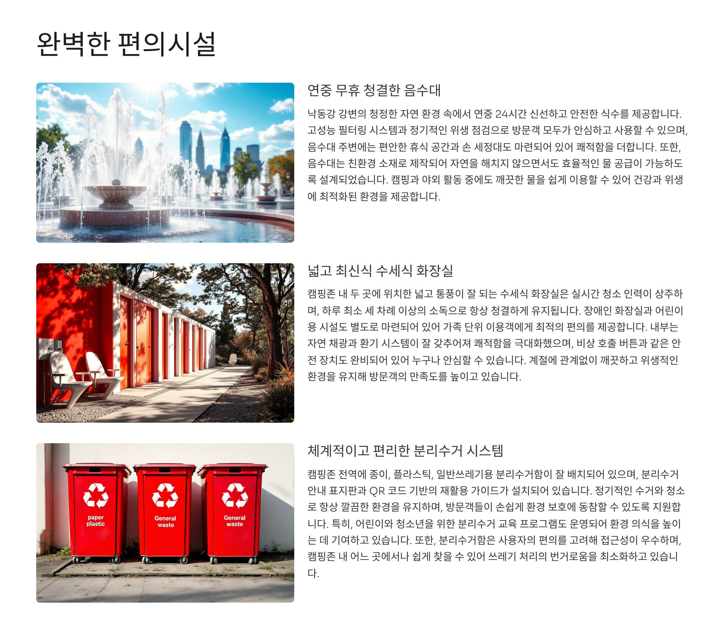 이런 시설들이 잘 갖춰져 있어 불편함 없이 캠핑을 즐길 수 있는 환경이 조성되어 있습니다.