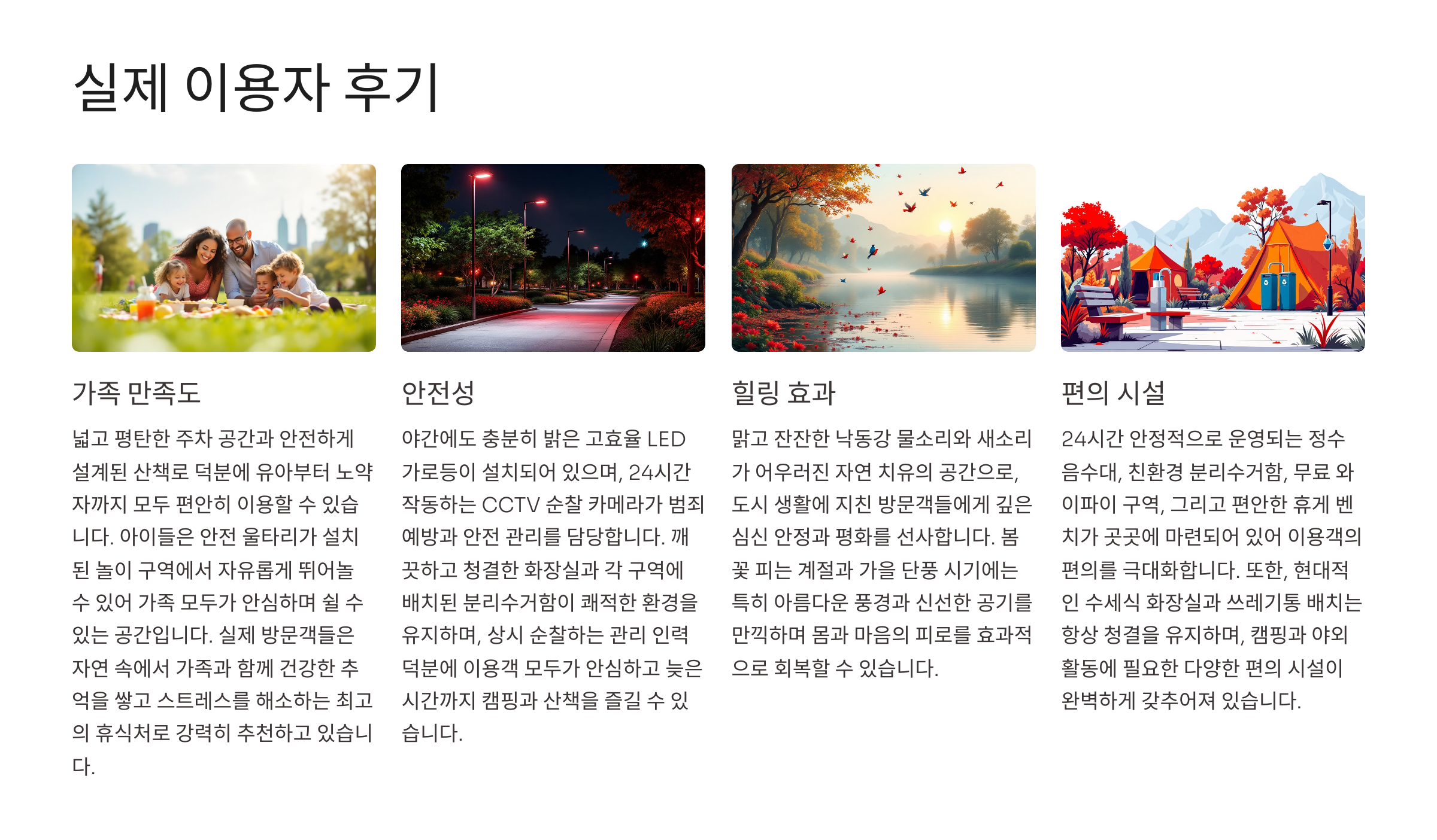 - “다른 차박 장소에 비해 소음이 적고, 자연경관이 좋아 힐링하기 딱 좋습니다.”