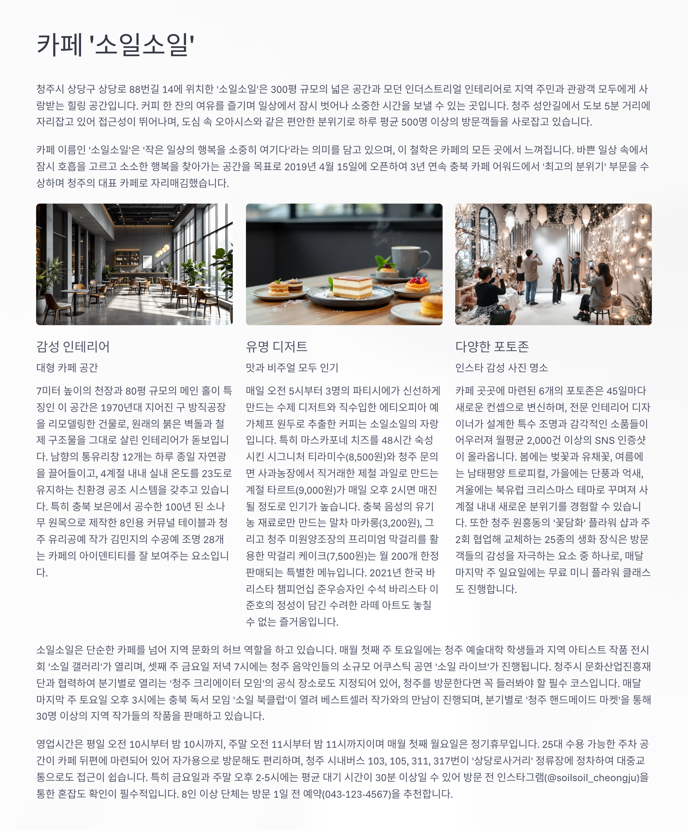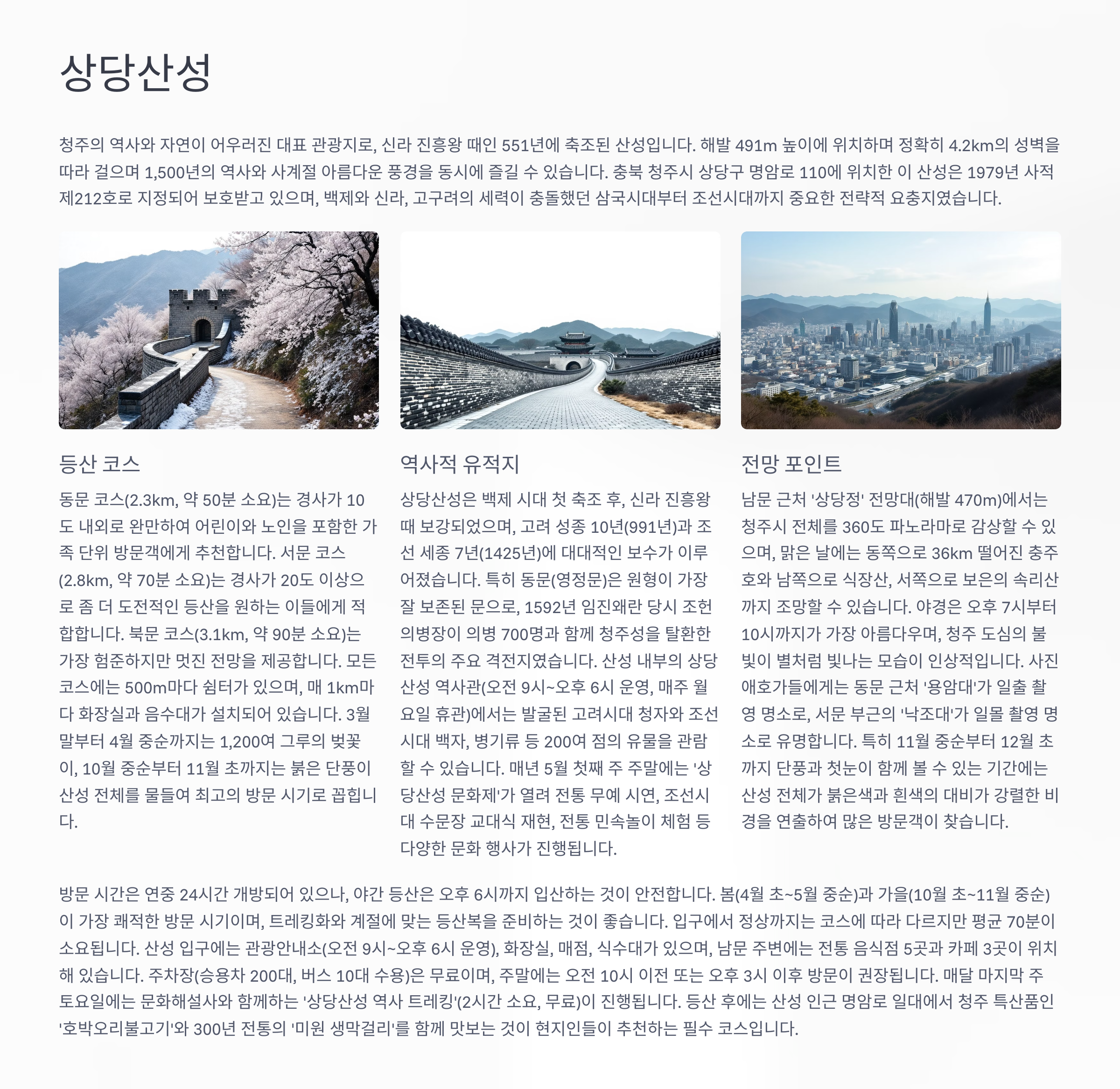 이 외에도 청주는 교통이 편리하고, 당일치기 혹은 1박 2일 코스로도 충분히 즐길 수 있는 여행지예요.