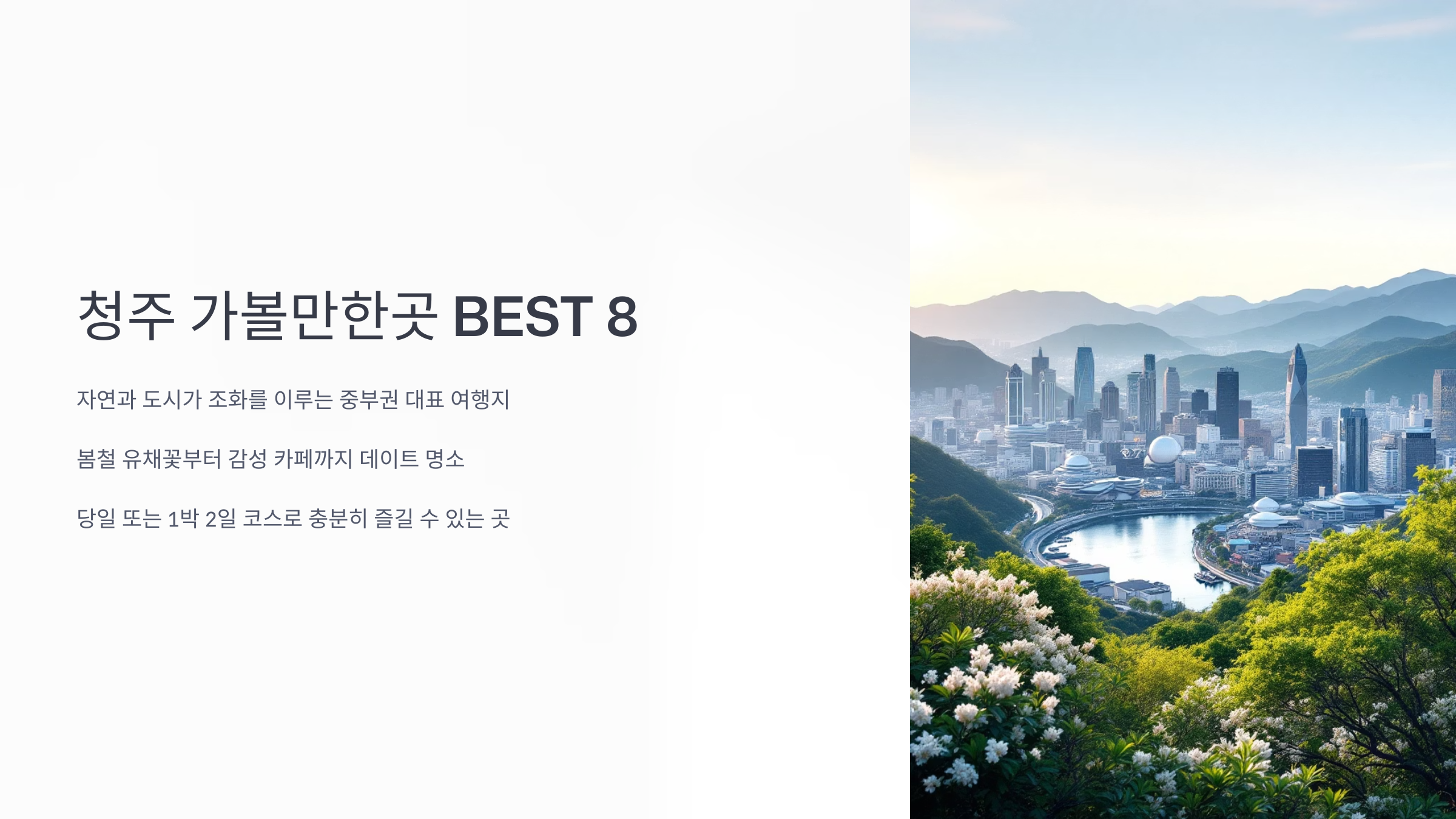 오늘은 유튜브에서 소개한 ‘청주 가볼 만한 곳 BEST 8’을 정리해 드릴게요. 실제 방문 후기와 사진을 참고해 여행 코스를 계획해 보세요!