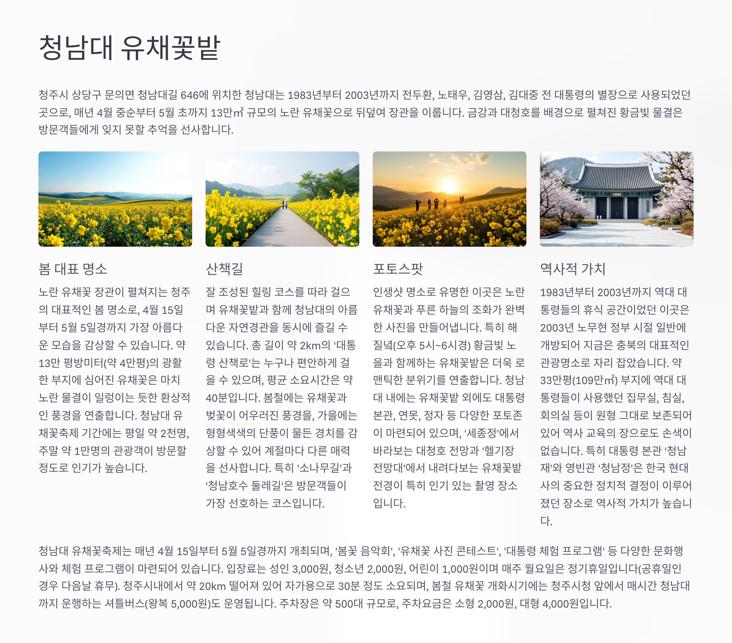 청주는 자연과 도시가 조화를 이루는 중부권의 대표적인 여행지입니다. 특히 봄철에는 유채꽃이 만개한 자연 명소부터 감성 넘치는 대형 카페까지, 주말 나들이나 데이트 장소로 인기가 많습니다.