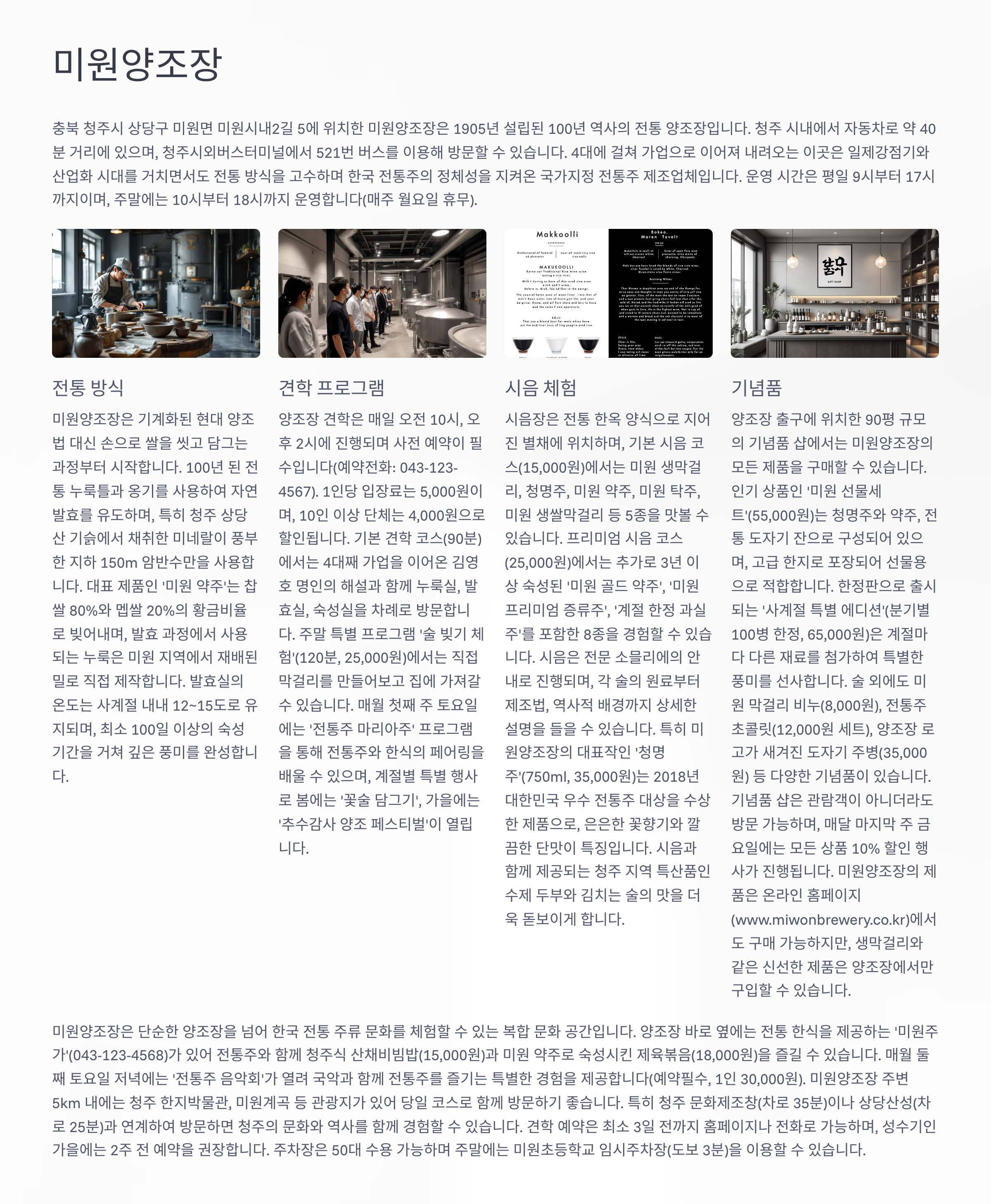 전통 방식으로 술을 빚는 양조장으로, 견학도 가능하고 시음도 할 수 있어요.