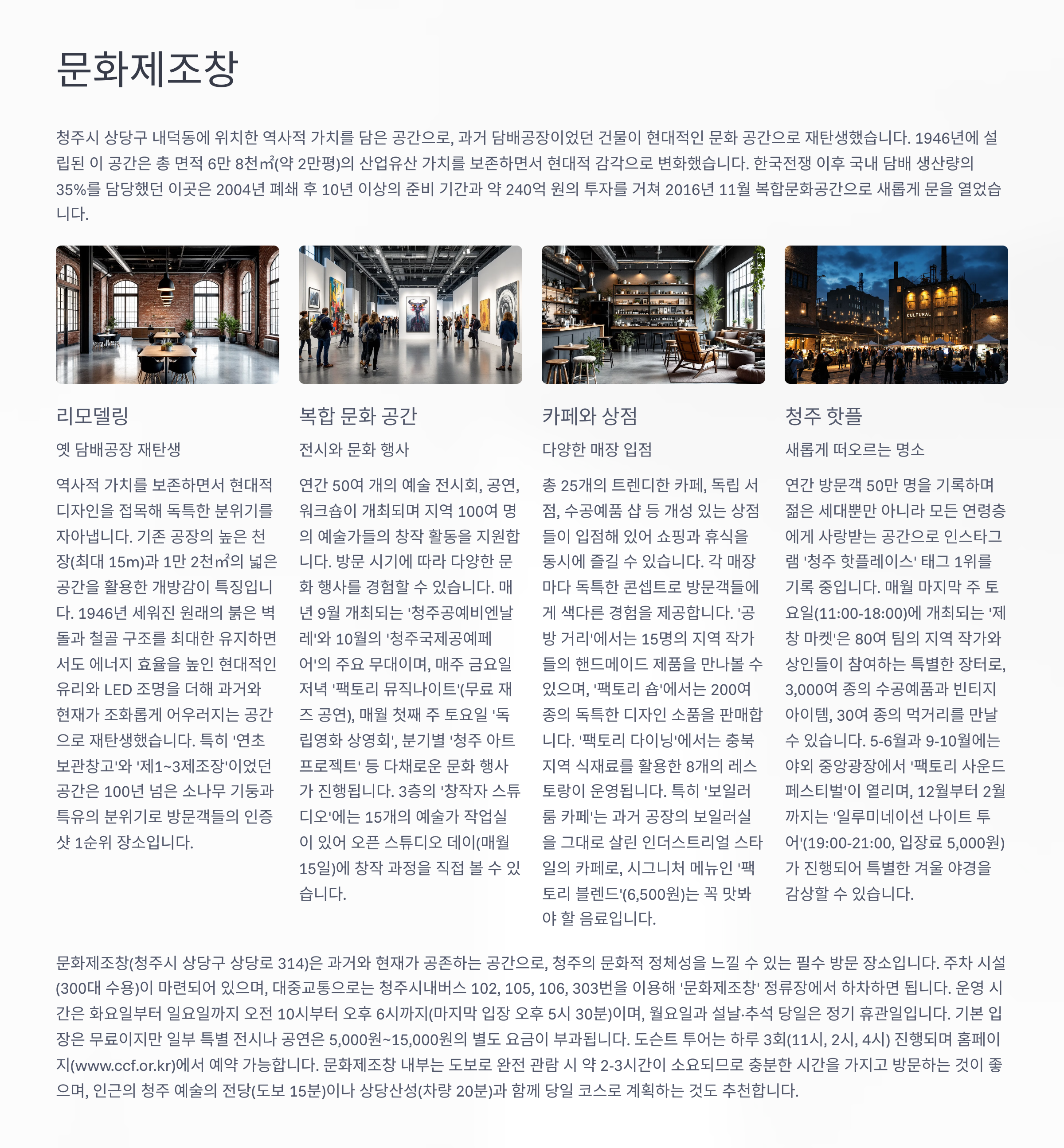 옛 담배공장을 리모델링해 만든 복합 문화 공간으로, 전시, 카페, 상점 등이 입점해 있어 청주의 새로운 핫플로 떠오르고 있습니다.