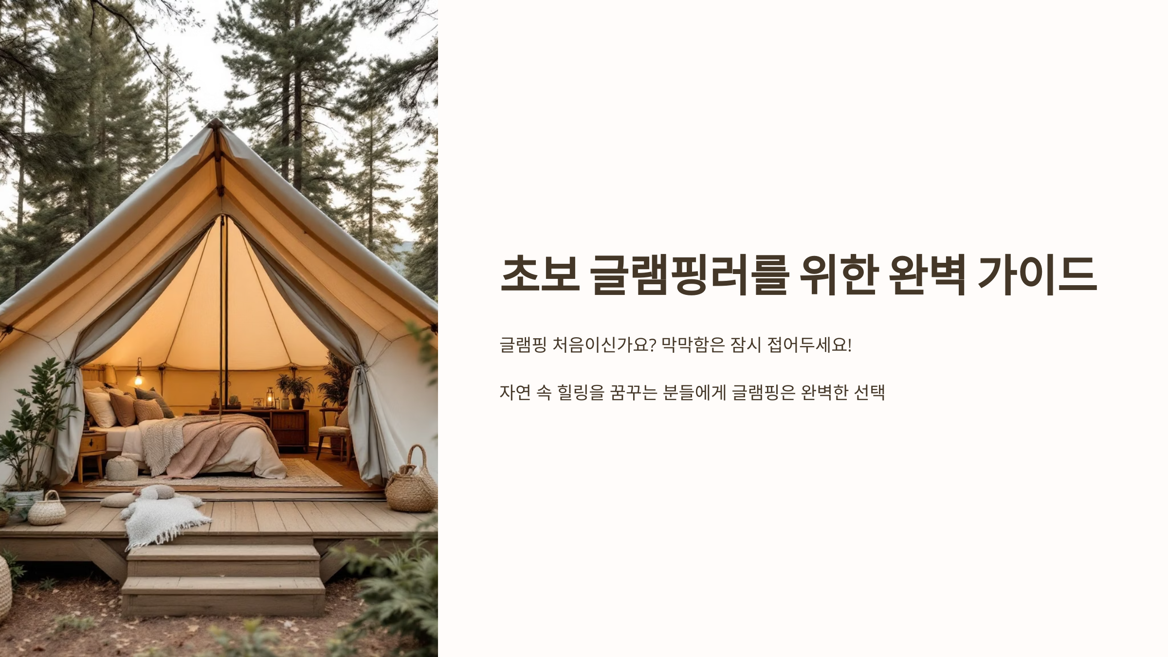 글램핑은 텐트 설치나 장비 준비 없이 편리한 숙박 환경을 제공해 캠핑 초보자도 쉽게 즐길 수 있습니다.