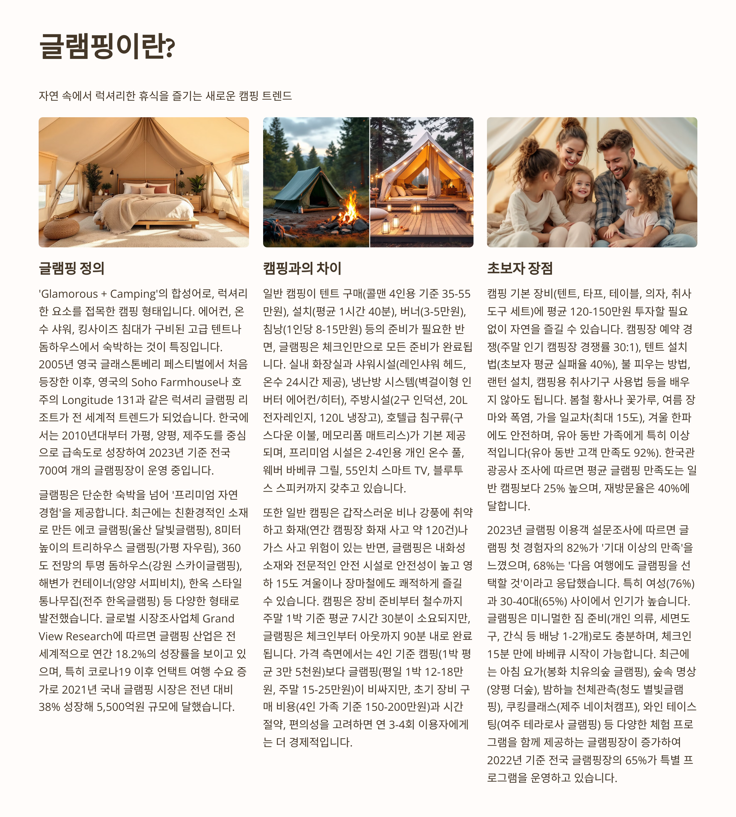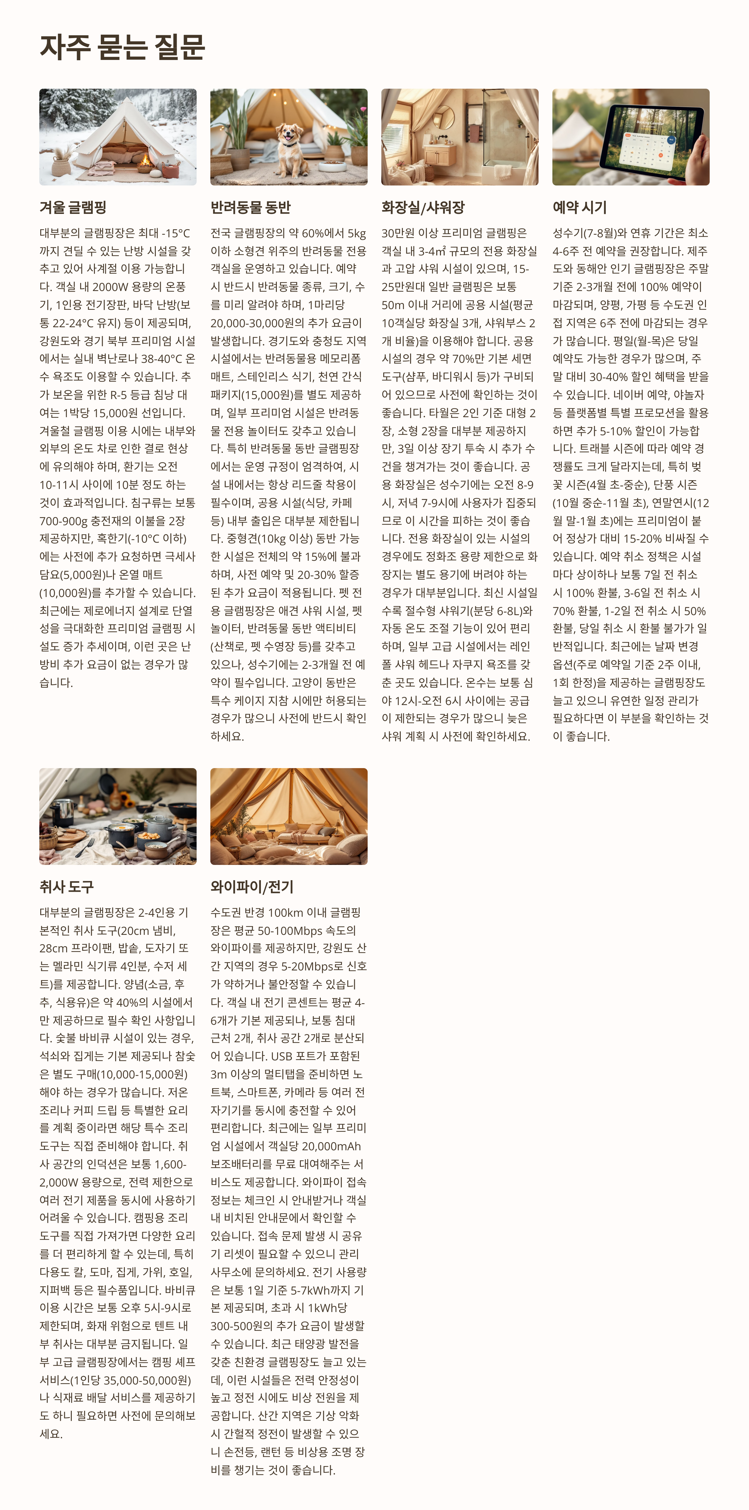 | 숙소 형태 | 글램핑 텐트, 카라반, 돔형 등 다양 |