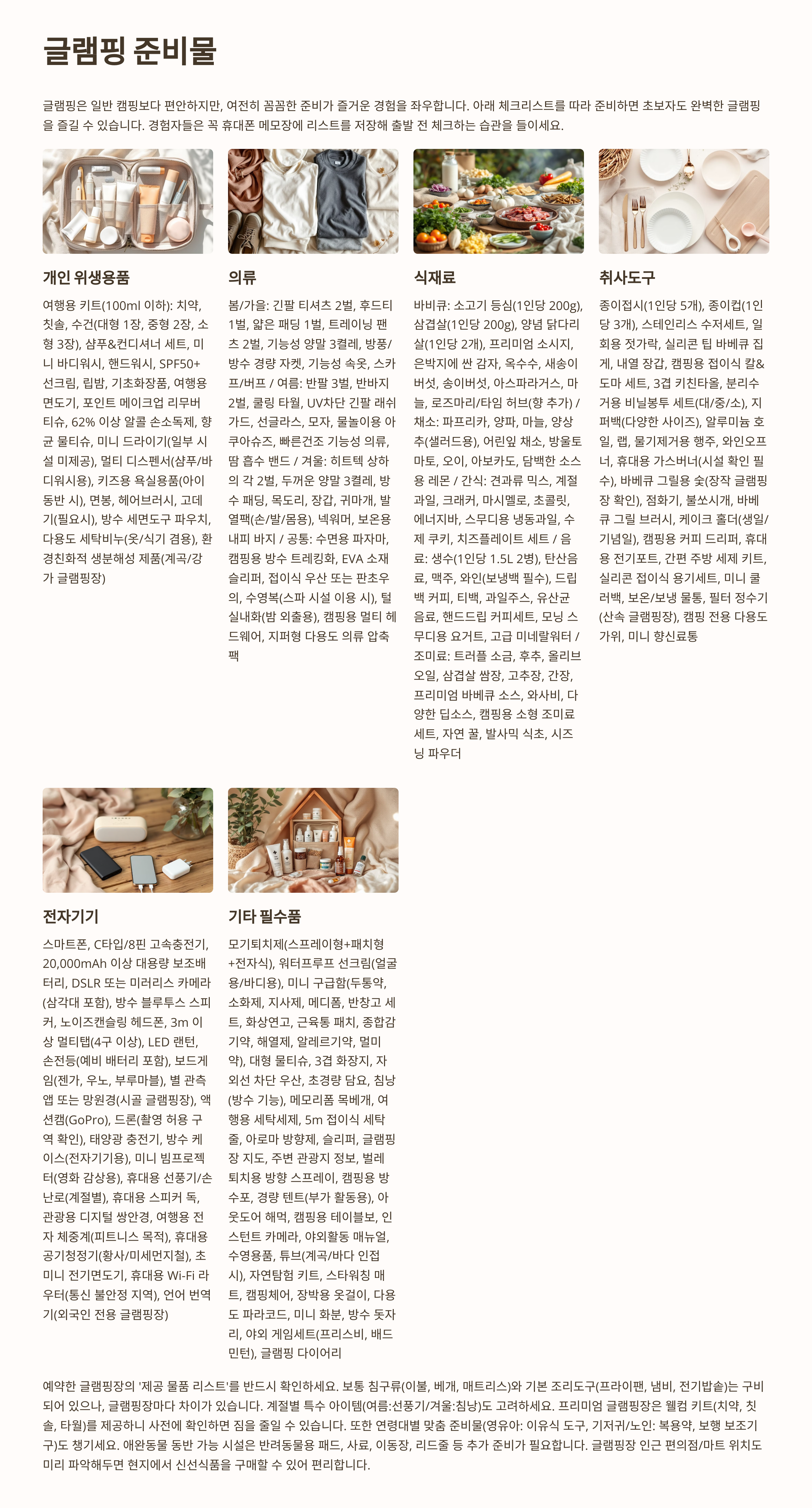 글램핑은 대부분의 장비가 마련되어 있어 준비가 간단하지만, 개인 위생용품과 편의 물품은 따로 챙기는 것이 좋습니다.