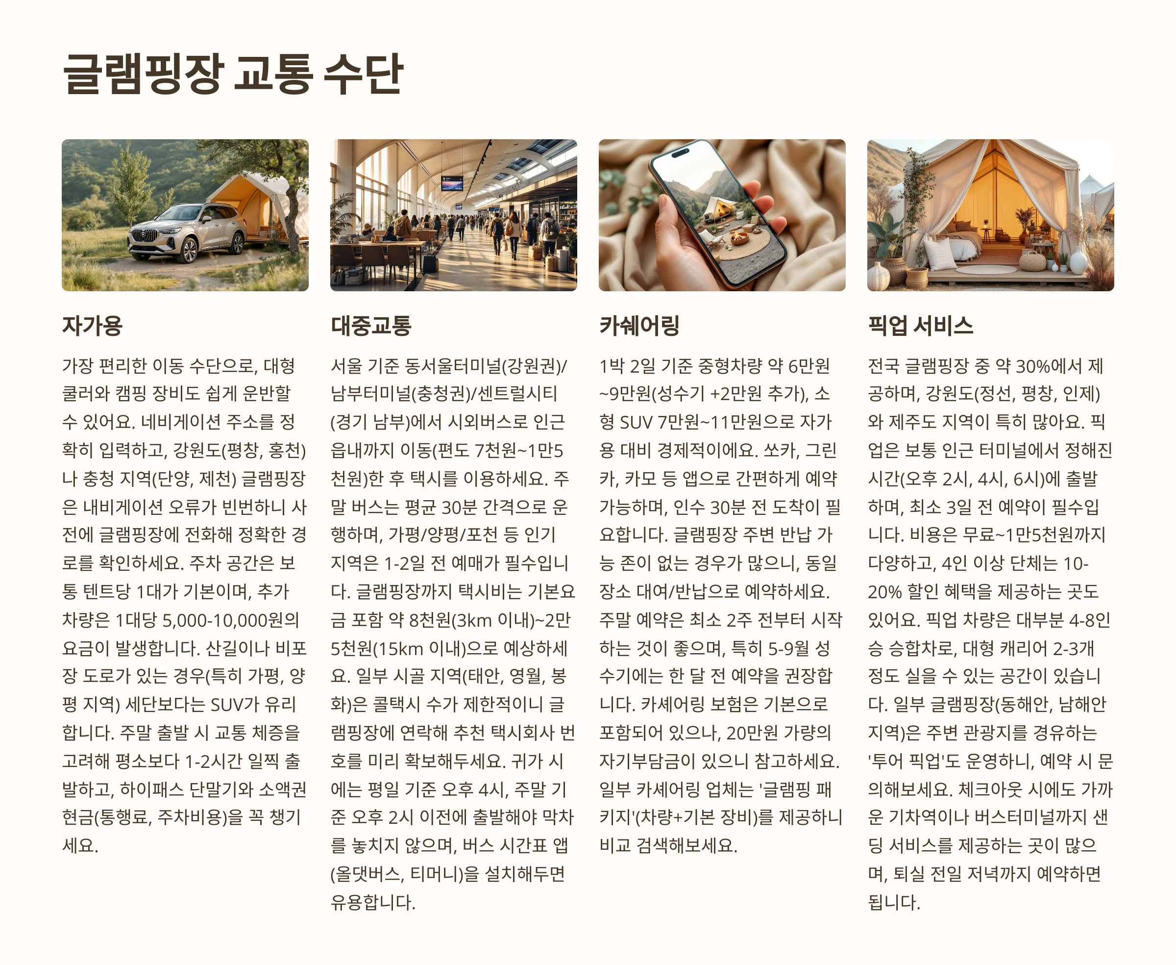 - 픽업 서비스: 일부 글램핑장은 사전 예약 시 제공