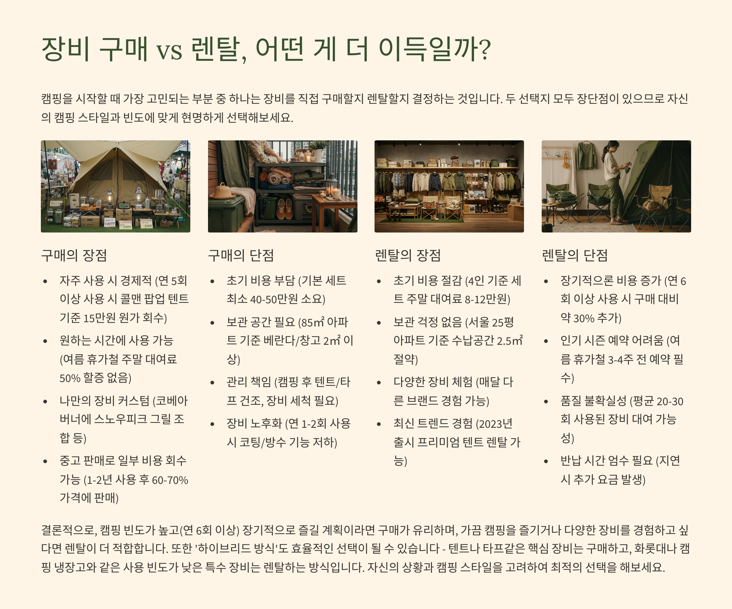 초보일수록 ‘장비를 살까 말까’ 고민이 많죠. 아래 표를 참고하면 어떤 선택이 자신에게 유리한지 쉽게 판단할 수 있습니다.