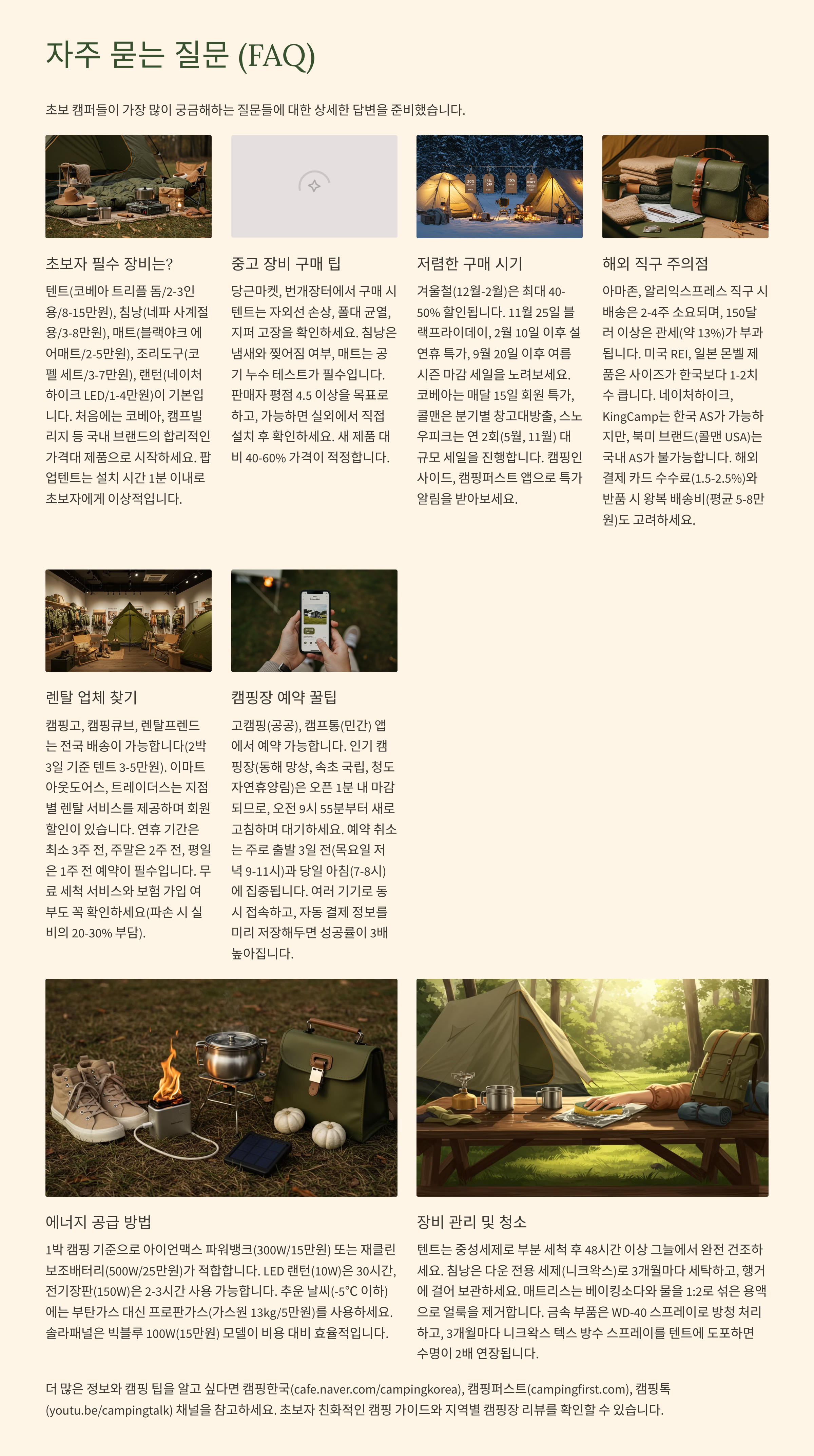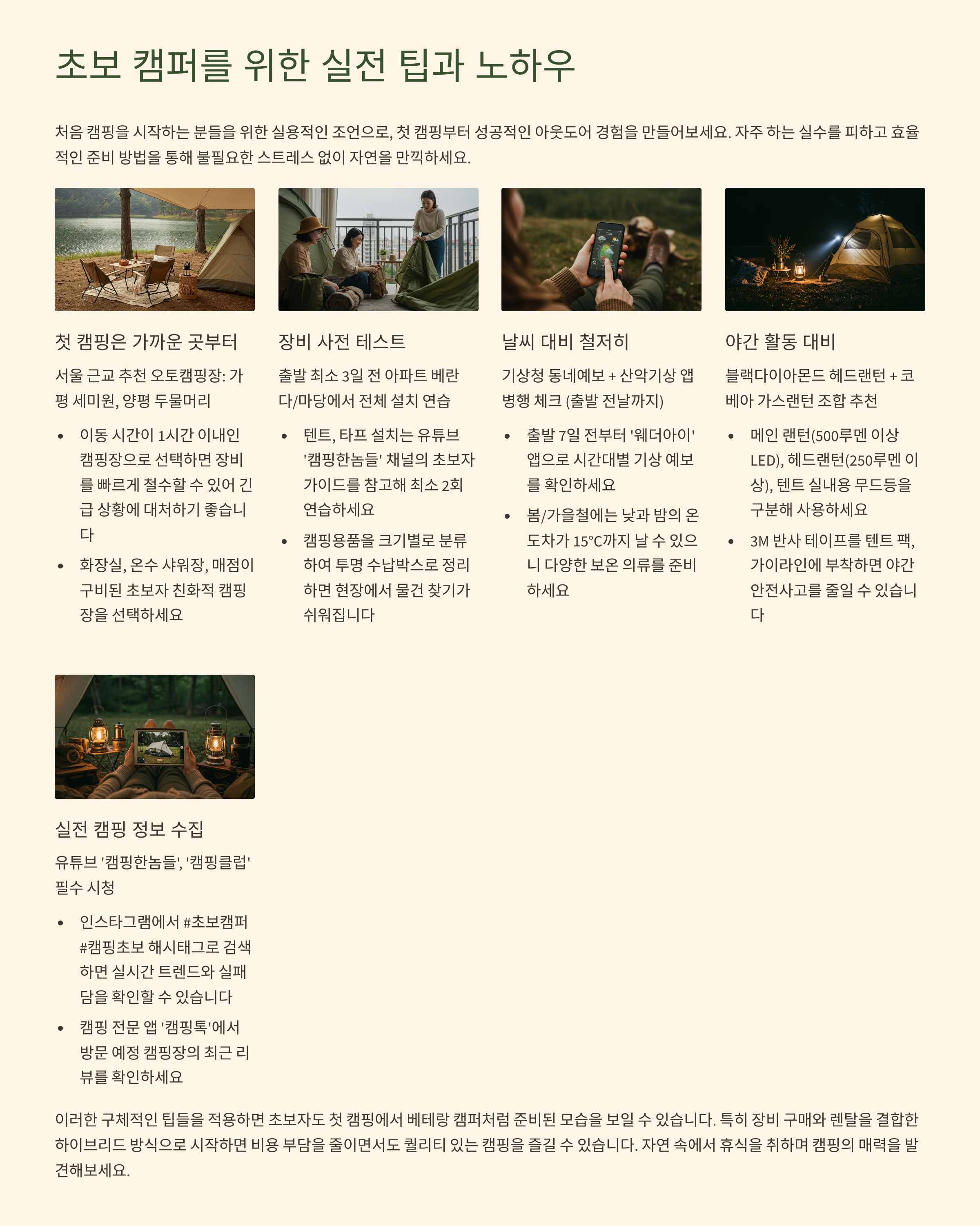 초보자일수록 장비 선택에 신중을 기하고, 사전에 충분히 준비하는 것이 캠핑을 훨씬 더 즐겁게 만들어줍니다.