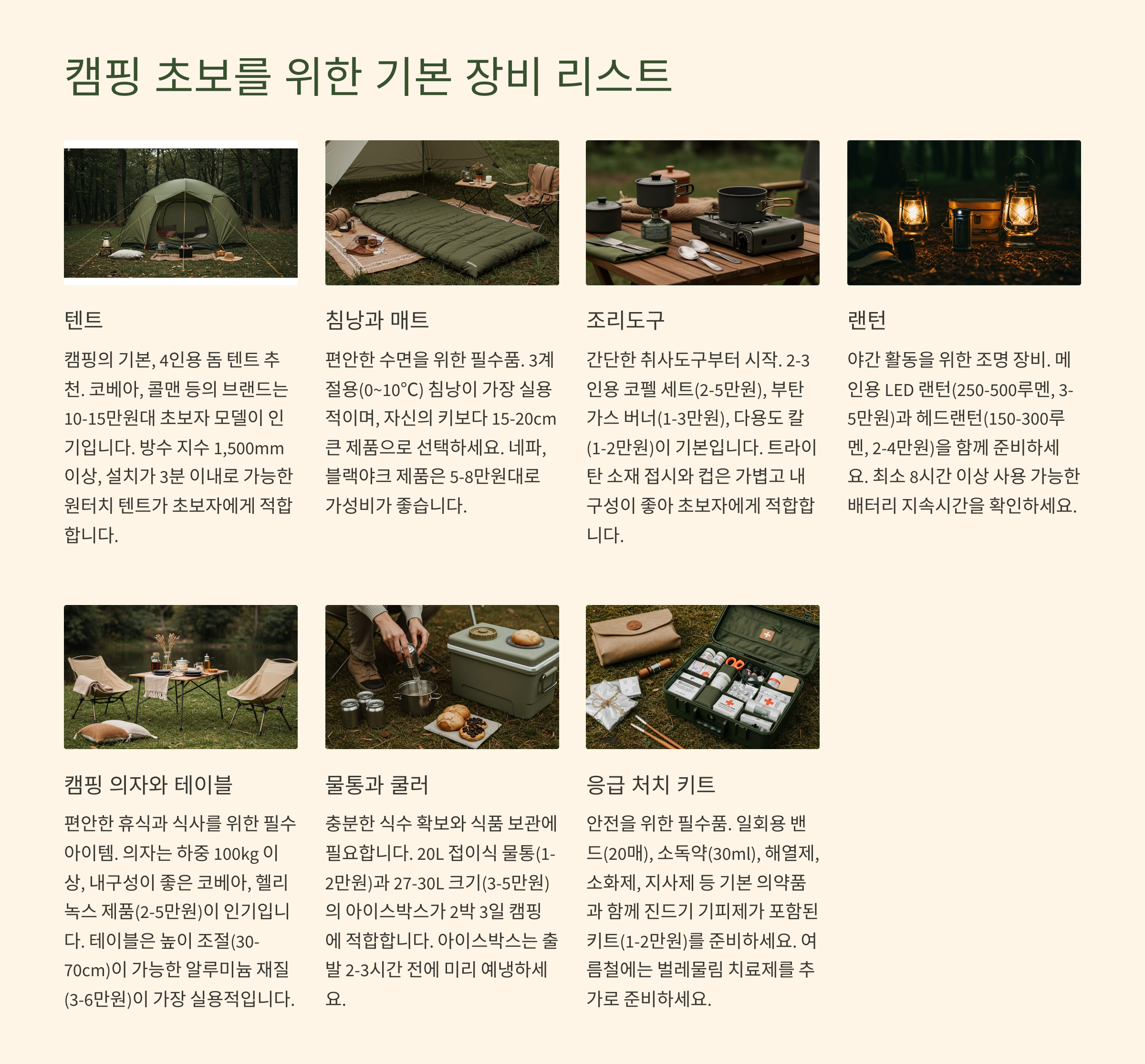 텐트, 침낭, 매트, 조리도구, 랜턴, 테이블과 의자 등이 기본이며, 이 외 장비는 점차 추가해 나가는 것이 좋습니다.