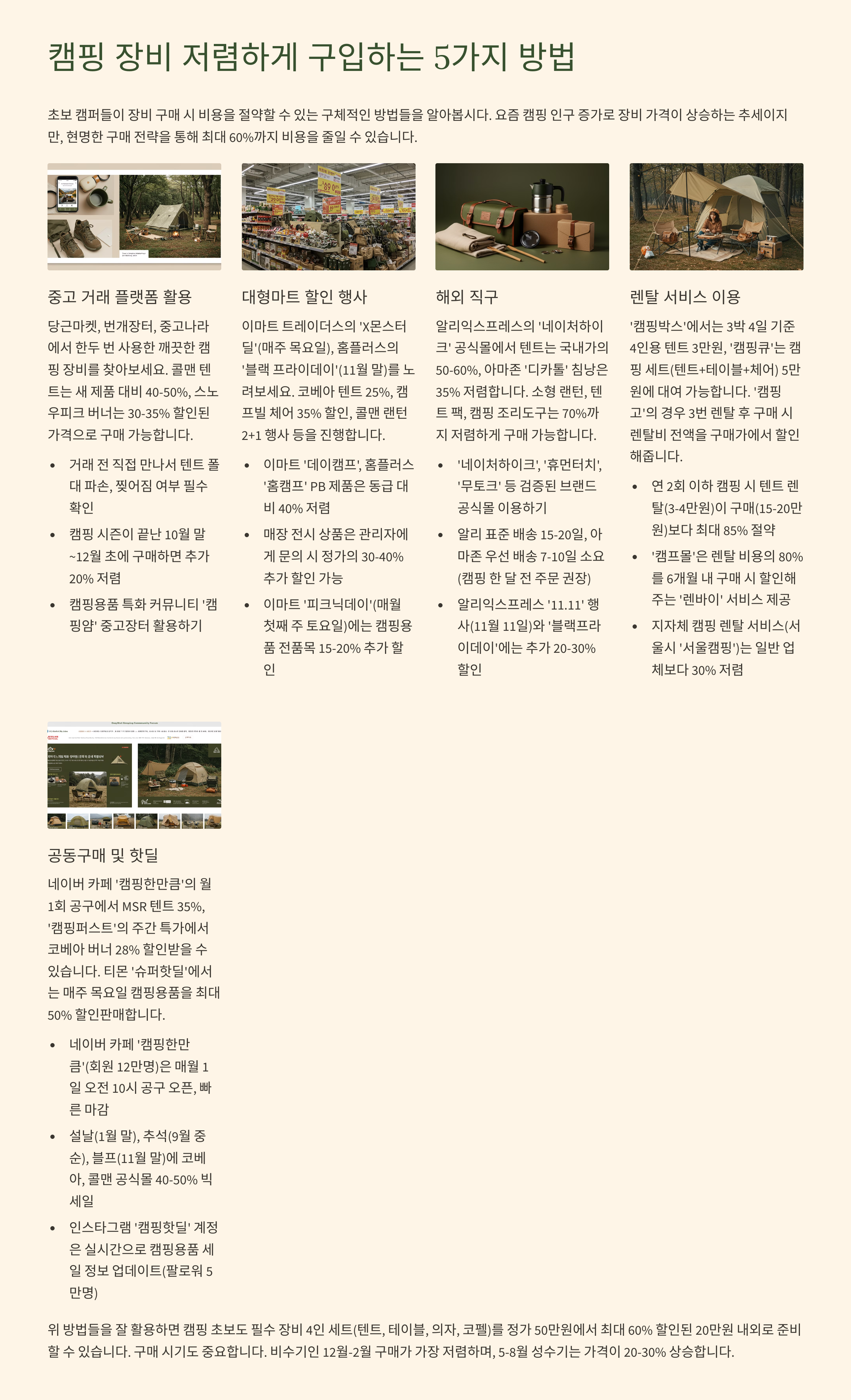 - 온라인 공동구매나 캠핑 커뮤니티 핫딜 활용