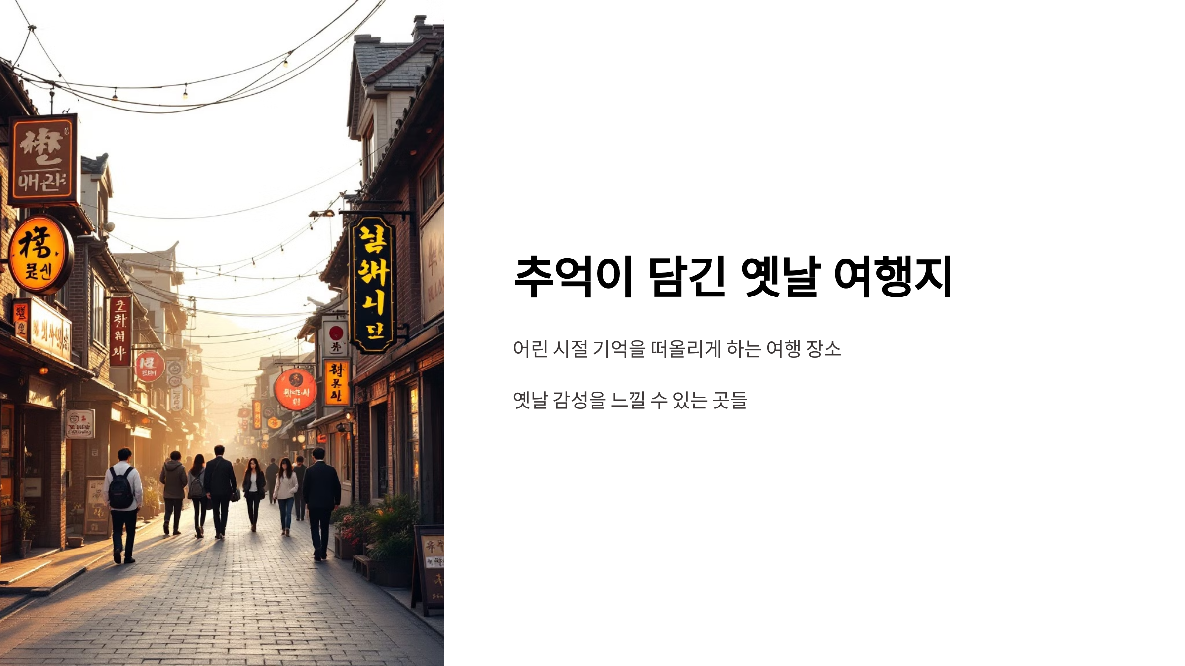 과거로의 작은 여행이 현재를 더 따뜻하게 만들어 줄 테니까요. 이번 주말, 추억이 깃든 곳으로 떠나보는 건 어떨까요? 😊