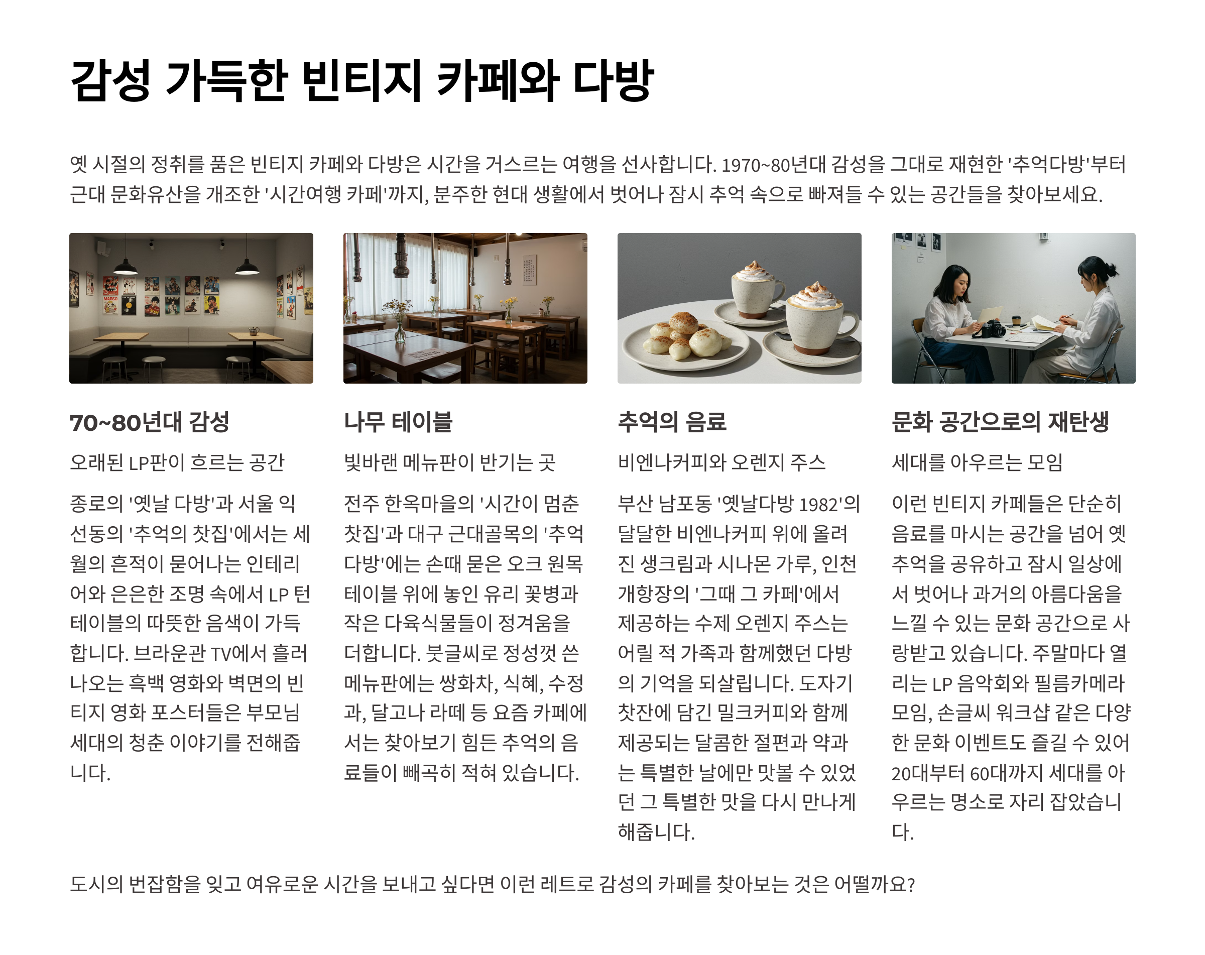 네, 일부 도시에는 빈티지 감성이 가득한 다방과 레트로 카페가 남아 있어요. LP 음악이 흐르고, 오렌지 주스와 비엔나커피를 팔던 그 시절 감성을 그대로 간직한 곳들이 있습니다.