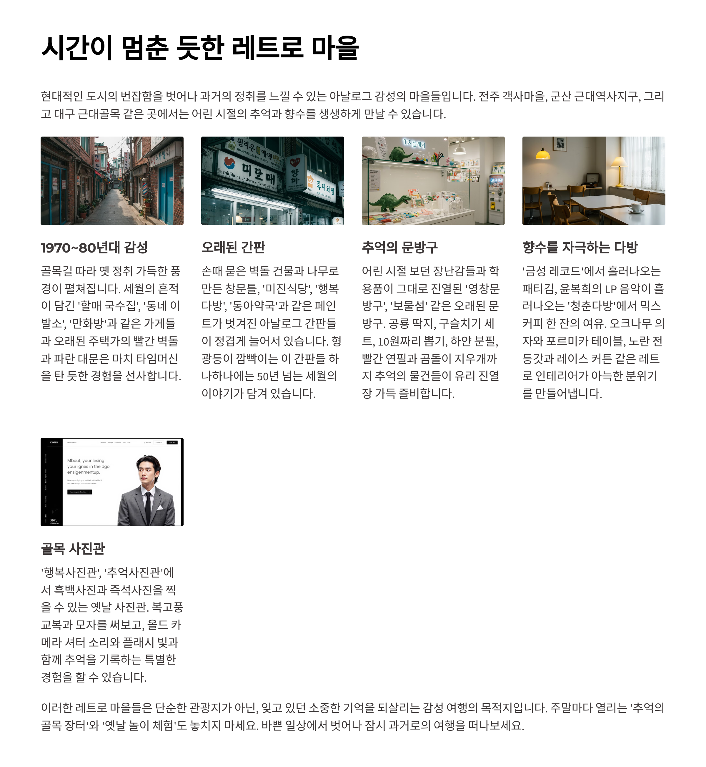 골목길을 따라 걷다 보면 1970~80년대의 감성이 가득한 레트로 마을이 있습니다. 오래된 간판, 손때 묻은 벽돌 건물, 그리고 어린 시절 문방구에서 보던 장난감들이 그대로 남아 있는 곳이죠. 이곳에서는 과거로 돌아간 듯한 기분을 느낄 수 있습니다.