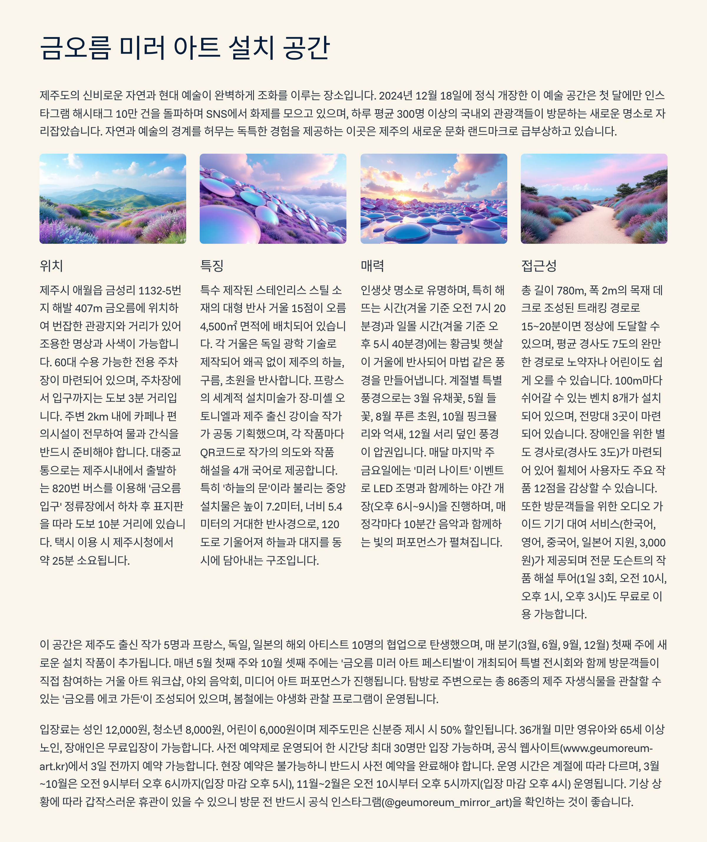 점차 더 많은 여행자들이 특별하고 개성 있는 장소를 원하면서, 금오름 미러 아트존, 워터월드, 페이지구백과 같은 이색 명소들이 큰 주목을 받고 있습니다.