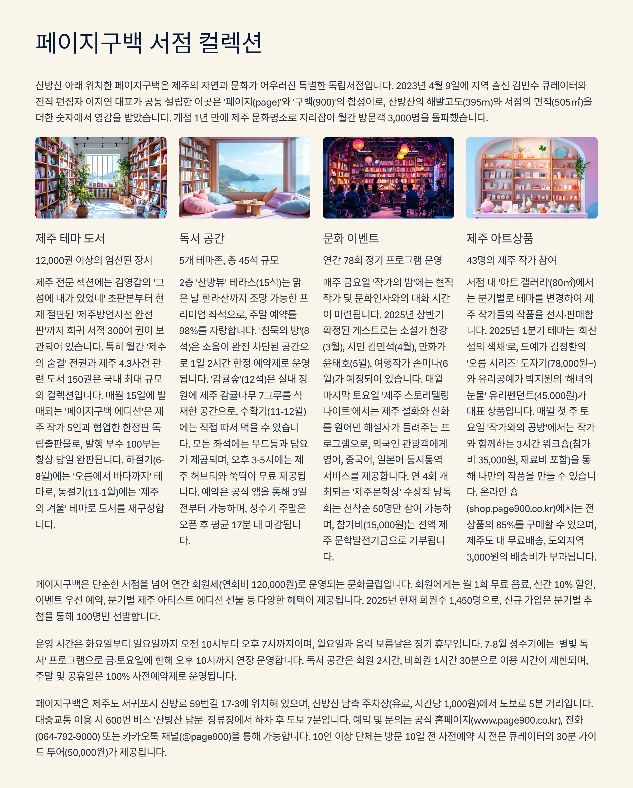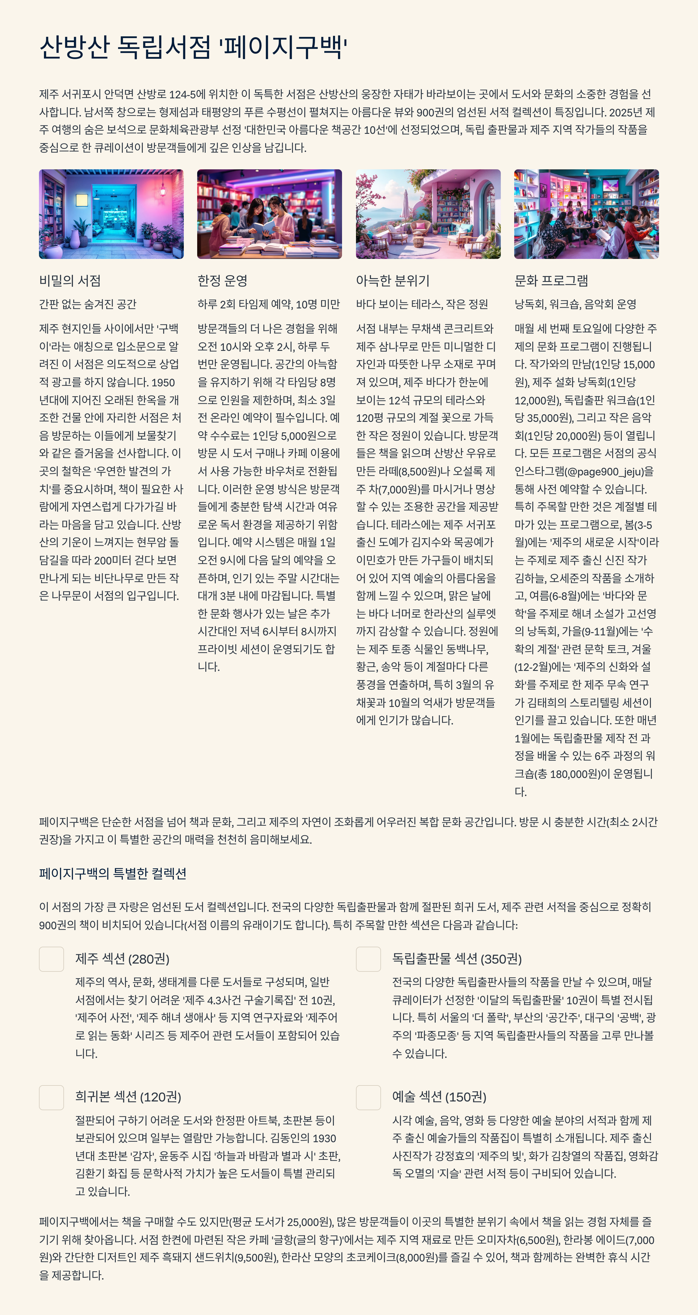 ‘페이지구백’은 제주 서귀포시 안덕면, 산방산 인근에 위치한 작은 독립서점입니다. 겉으로는 간판도 없고 외부 노출이 적어 ‘비밀의 서점’이라 불리지만, 그 안에는 섬세한 감성과 철학이 깃든 공간이 숨어 있습니다.
