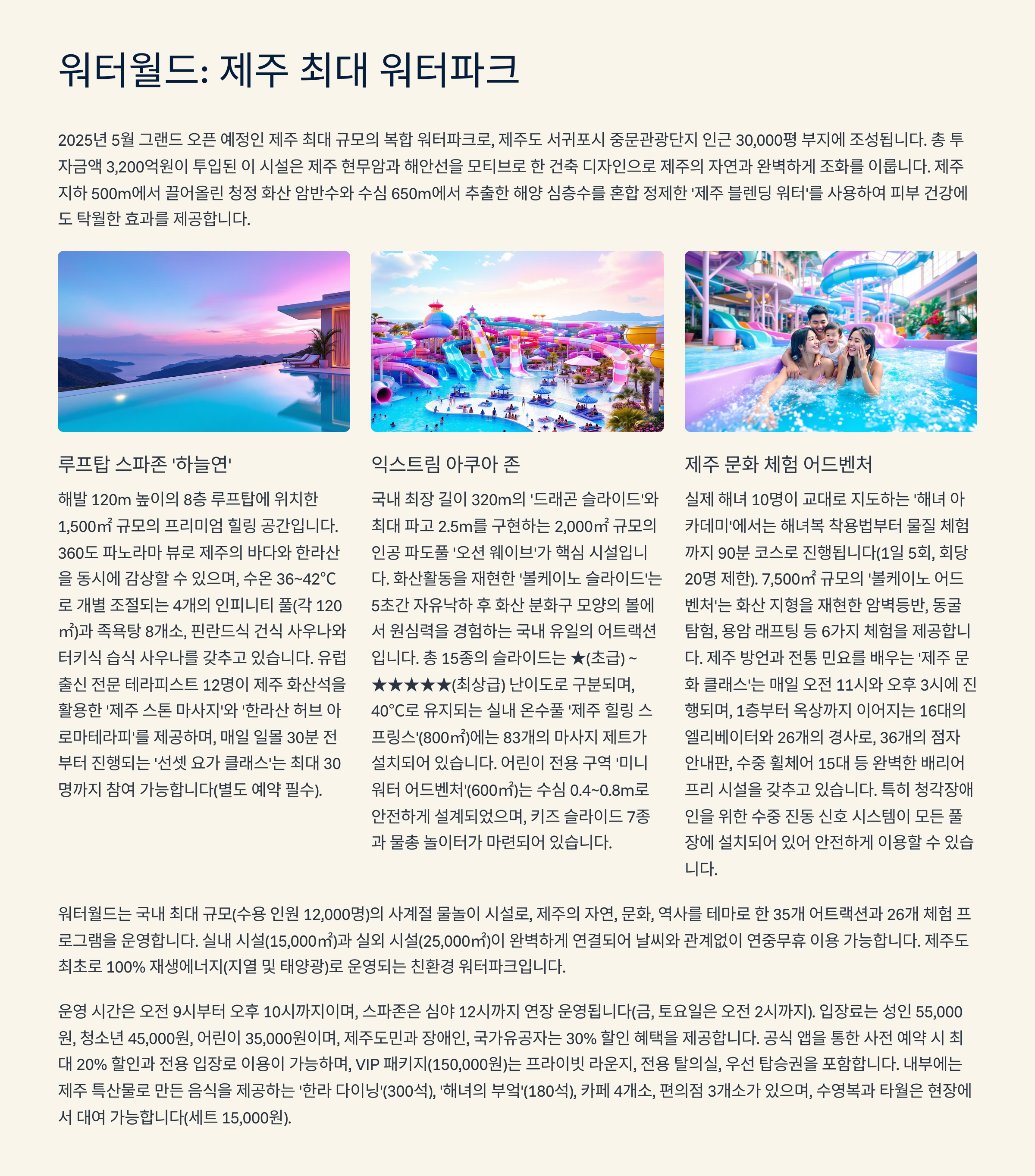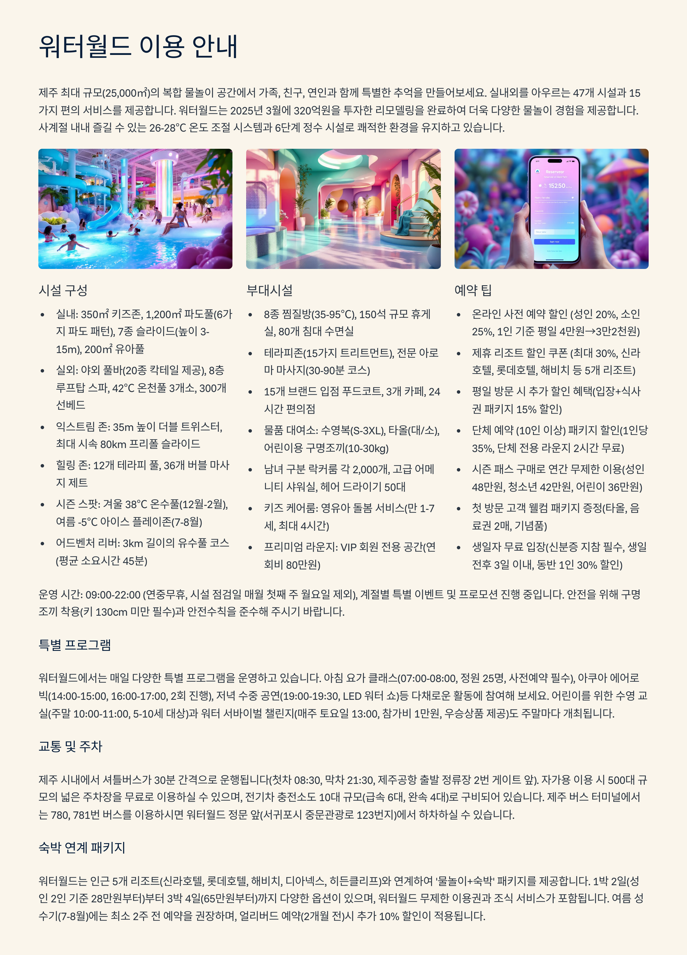 특히 많은 여행자들이 궁금해하는 워터월드도 포함하여, 제주 여행을 계획 중인 분들에게 실질적인 도움을 드릴 수 있도록 구성했습니다.