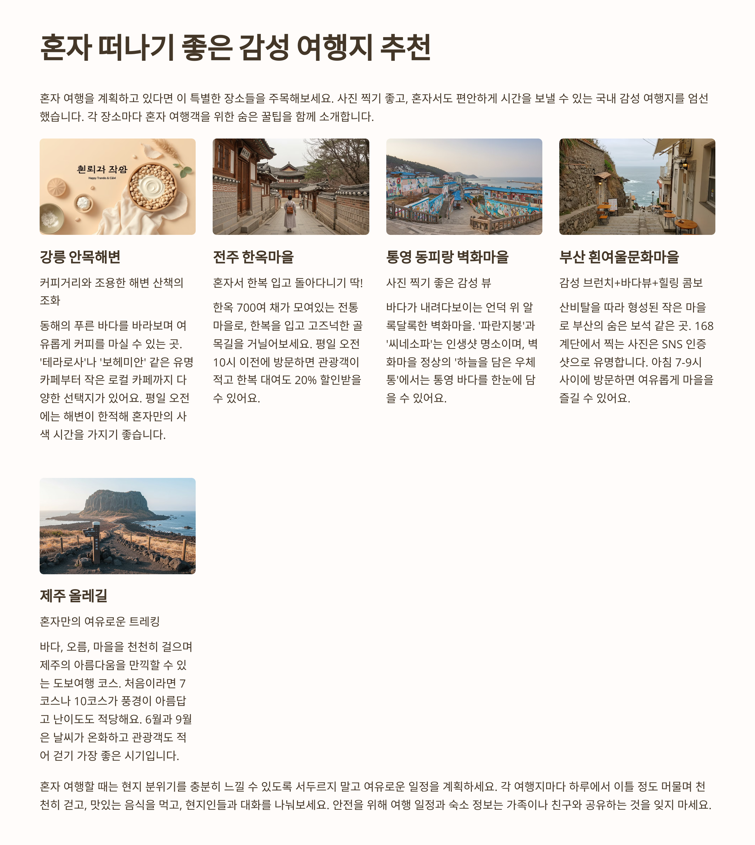 혼자여도 외롭지 않고, 오히려 더 자유롭게 나를 돌아볼 수 있는 그런 감성 여행지 어디일까요? 전부 다 다녀본 건 아니지만, 아래 리스트는 제가 직접 가본 곳과 친구들의 추천을 바탕으로 정리했어요.