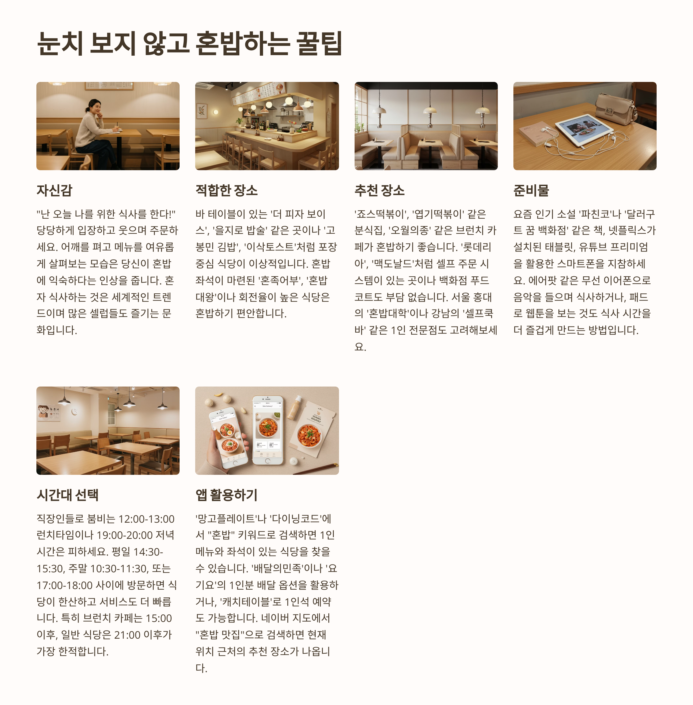 혼자 밥 먹는 게 왜 부끄러운 일일까요? 사실은 전혀 그렇지 않아요. 저도 예전에는 괜히 사람들 눈치 보느라 편의점 삼각김밥으로 끼니 때우곤 했는데, 이제는 혼밥 마스터가 되었답니다.