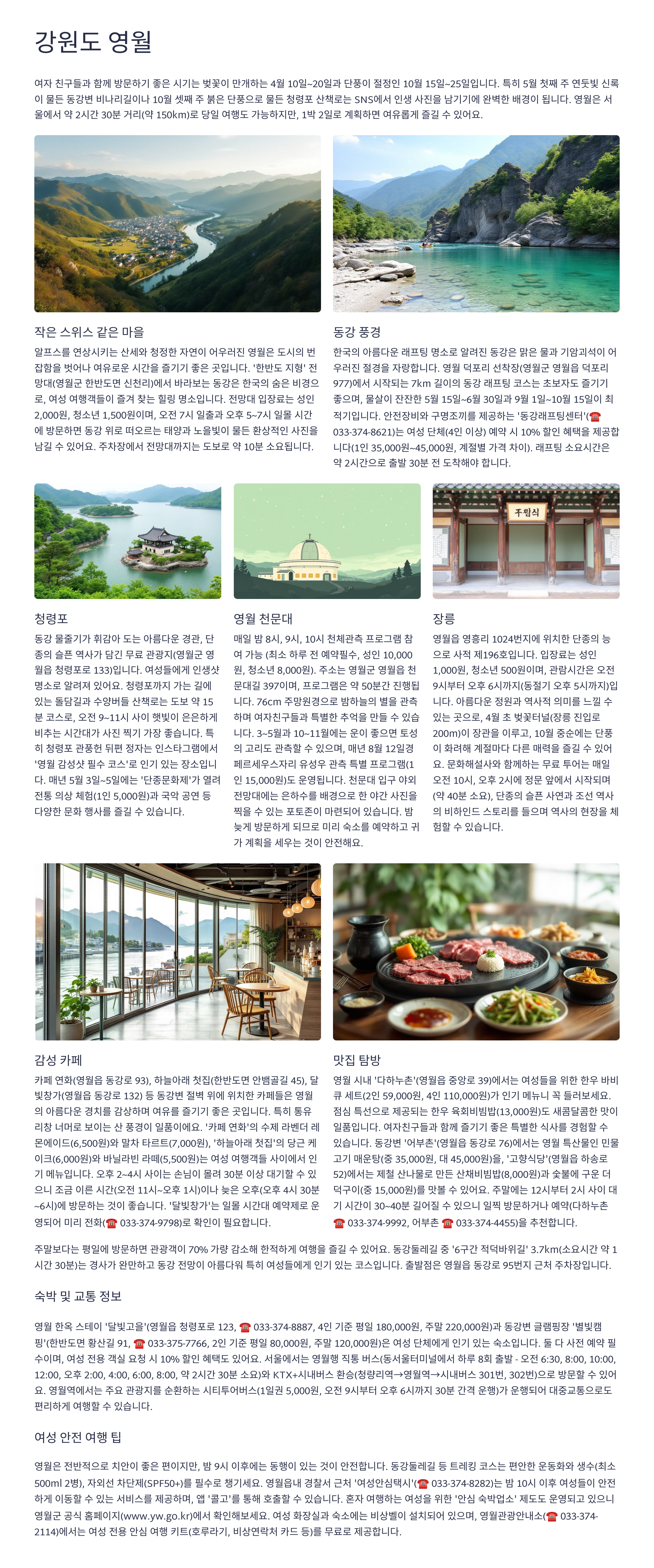 | 힐링 명소 | 김삿갓 유적지, 동강둘레길, 영월 천문대 |