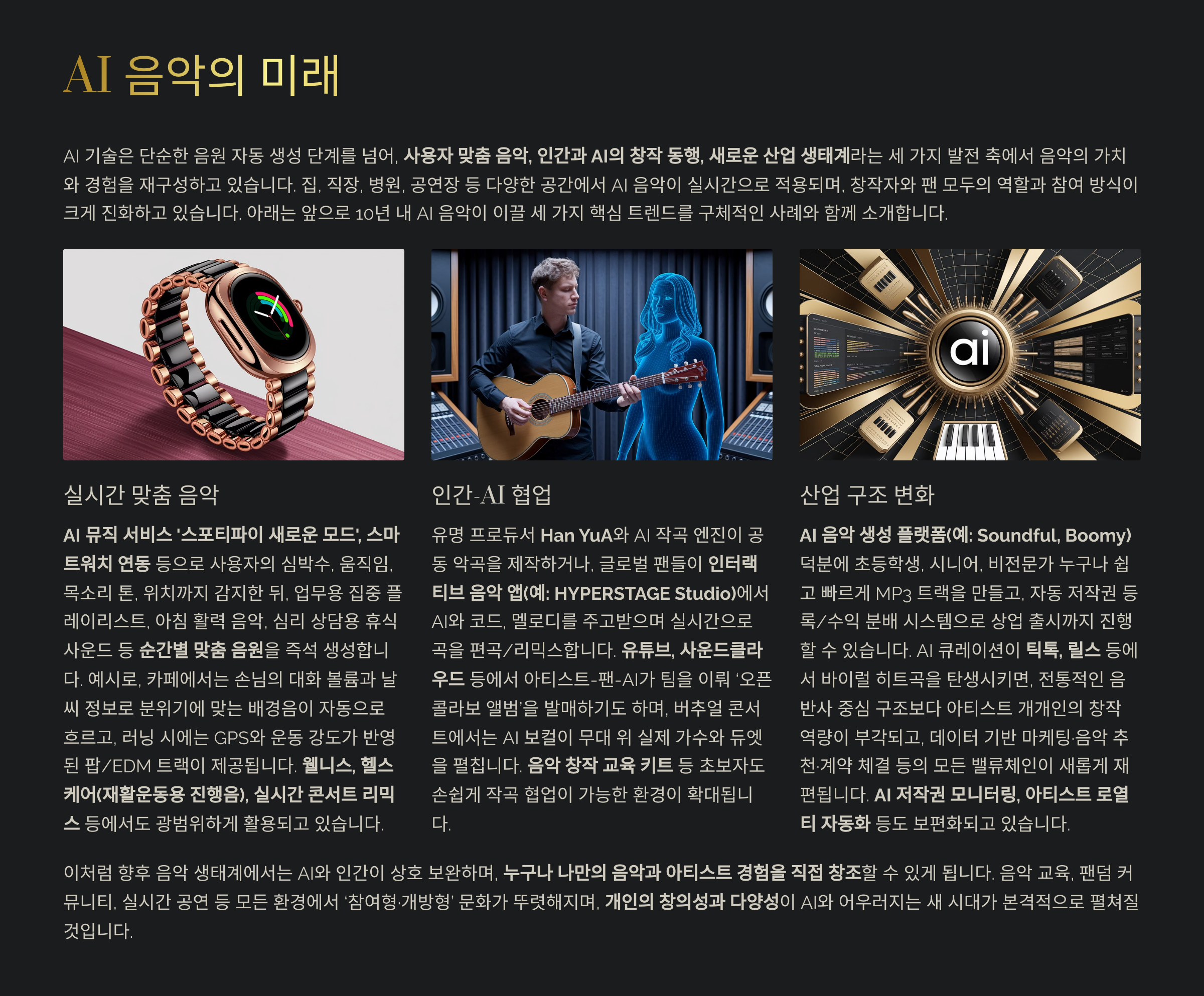 앞으로는 각자의 감정 상태에 맞는 음악을 AI가 실시간으로 작곡해서 들려주는 시대도 머지않았습니다.