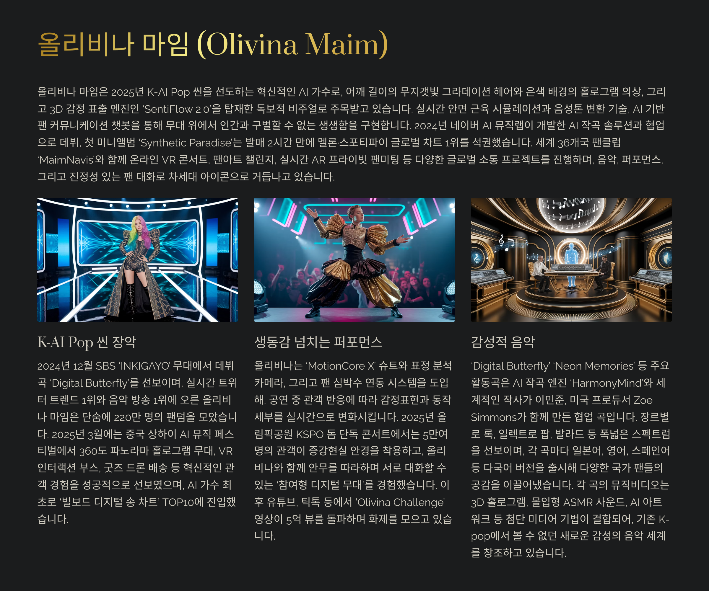 Olivina Maim은 2024년 말 데뷔하여, 2025년 상반기 K-AI Pop 씬을 완전히 휘어잡은 디지털 휴먼입니다.