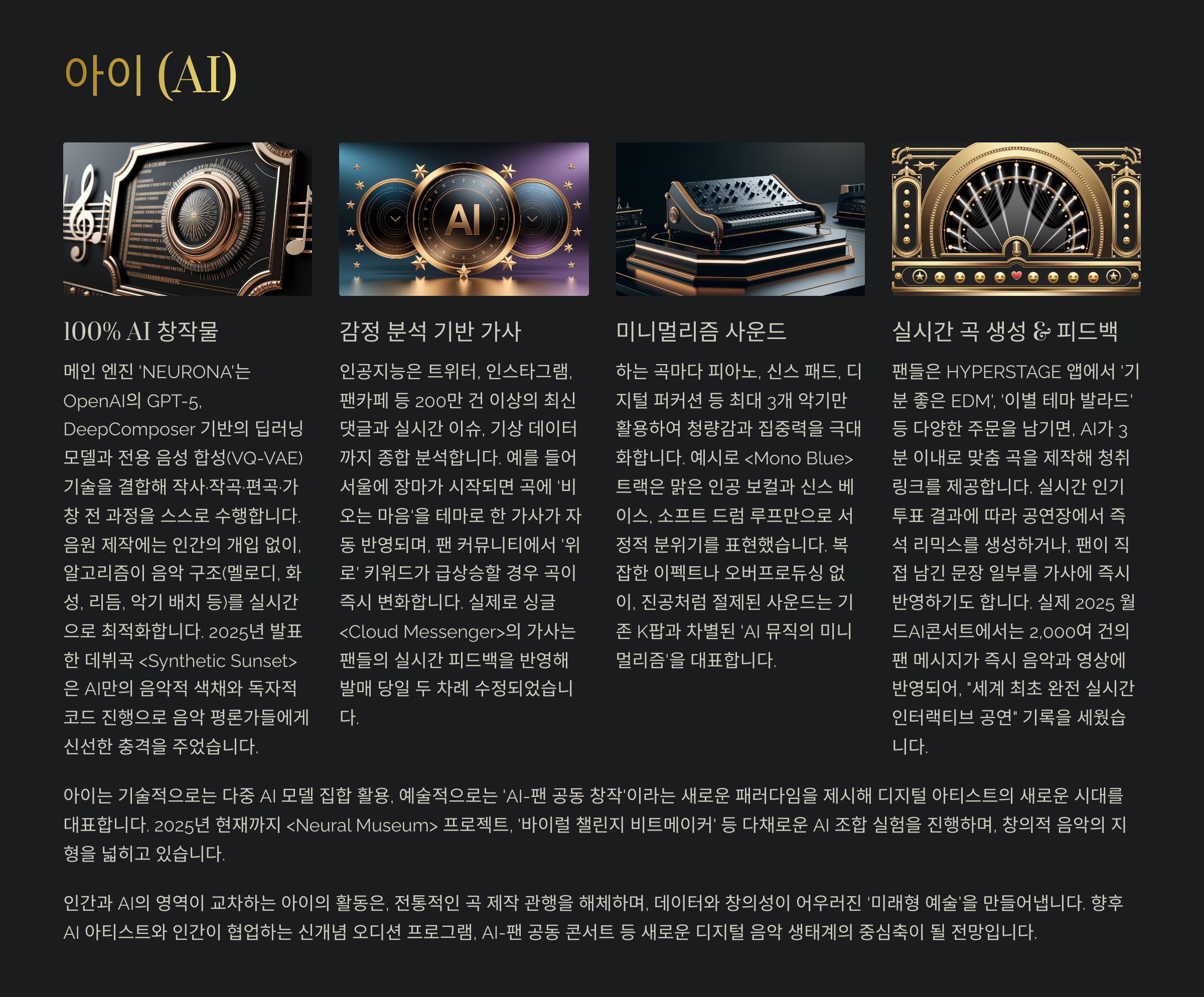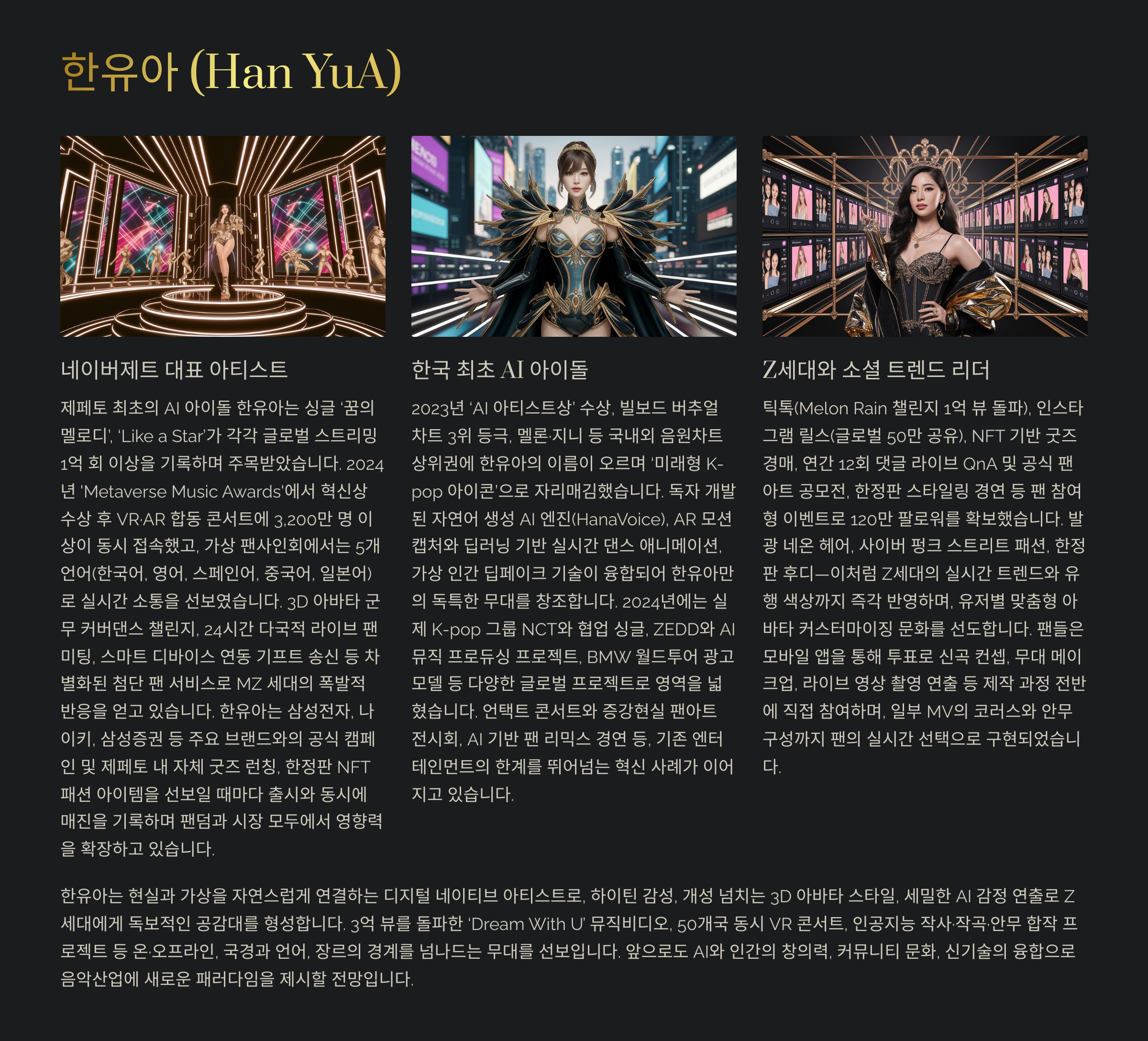 무대 위 퍼포먼스는 실제 아이돌 못지않은 생동감을 자랑하며, 그녀의 음악은 AI 작곡 알고리즘과 인간 작곡가의 협업으로 탄생한 감성적인 트랙이 많습니다.
