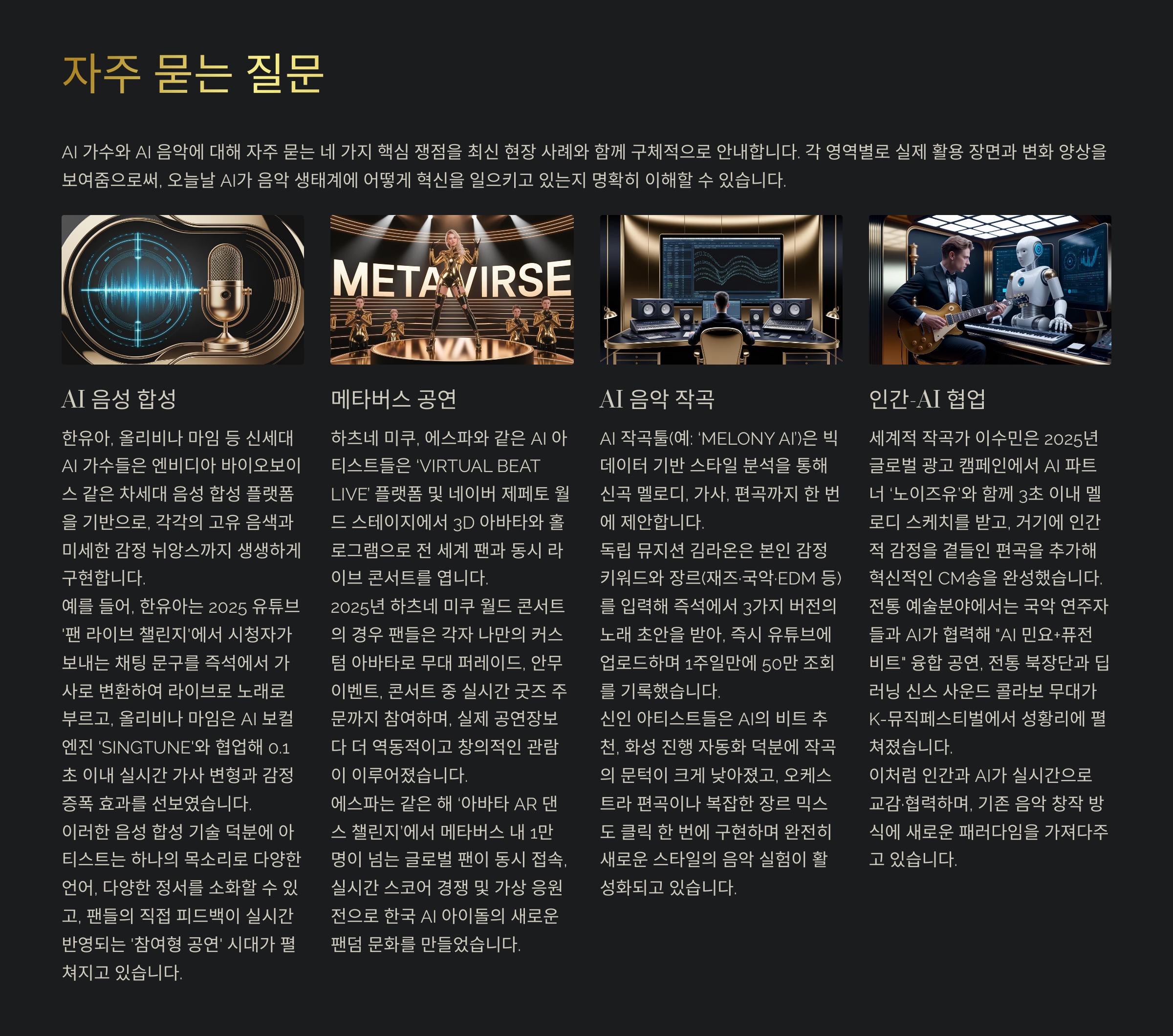 AI 가수들은 단순한 흥미를 넘어서, 음악 산업의 본질적 변화를 이끌고 있습니다.