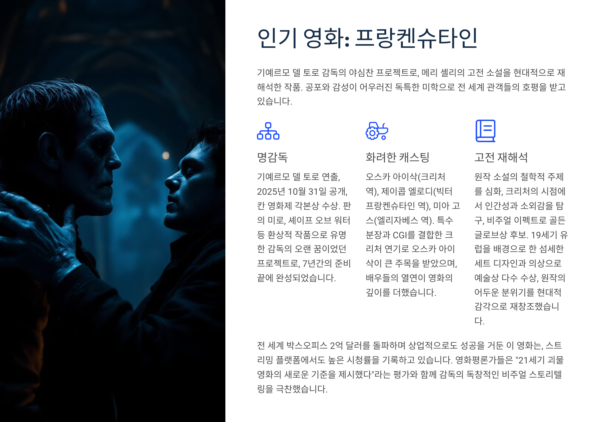 개요: 기예르모 델 토로 감독이 메가폰을 잡은 이 영화는 오스카 아이삭, 제이콥 엘로디, 미아 고스 등이 출연하며, 고전 소설 '프랑켄슈타인'을 새로운 시각으로 재해석한 작품입니다.