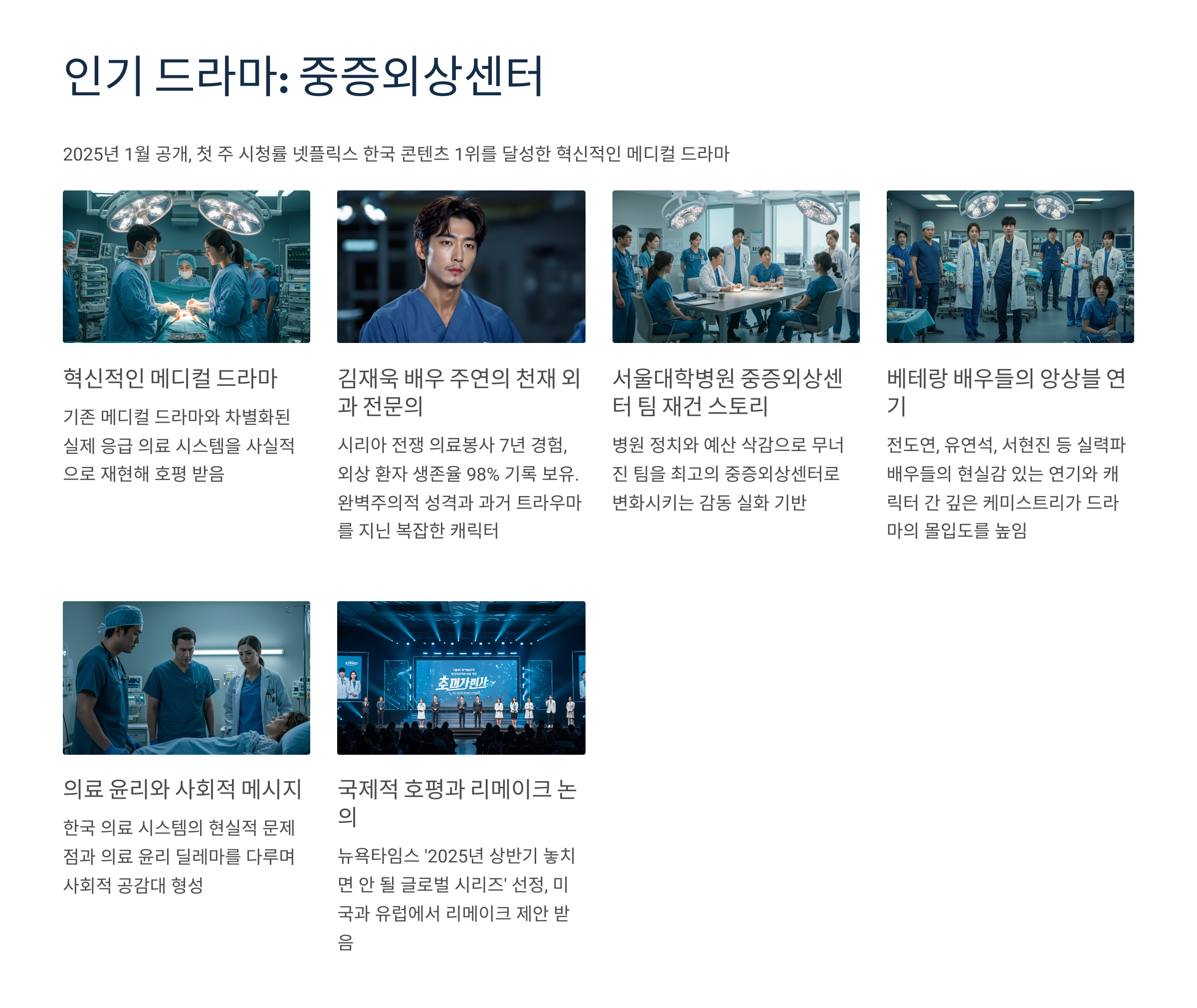 개요: 2025년 1월 24일에 공개된 메디컬 드라마로, 전쟁터를 누비던 천재 외과 전문의 백강혁이 유명무실한 대학병원 중증외상팀을 살리기 위해 부임하며 펼쳐지는 이야기를 그립니다.
