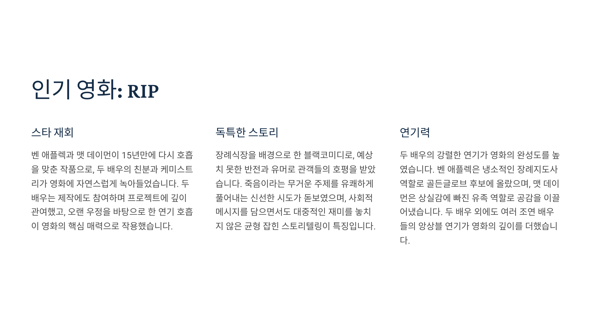 개요: 벤 애플렉과 맷 데이먼이 주연한 이 영화는 두 배우의 재회로 큰 화제를 모았으며, 독특한 스토리와 강렬한 연기로 관객들의 호평을 받았습니다.