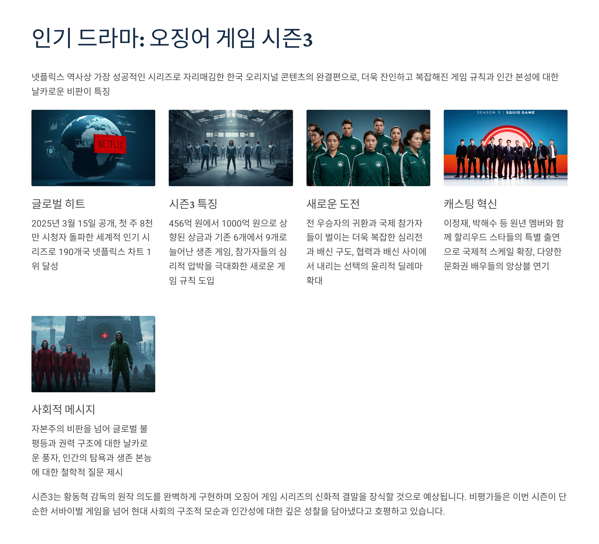개요: 전 세계적인 인기를 끌었던 '오징어 게임'의 세 번째 시즌으로, 참가자들의 생존 게임이 더욱 치열해집니다.