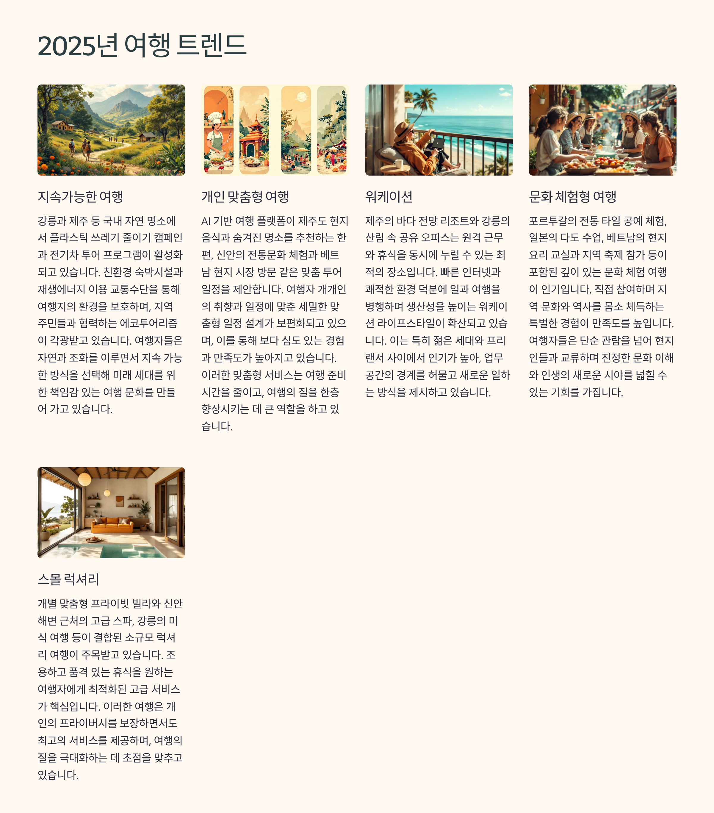 - 문화 체험형 여행: 단순히 보는 관광을 넘어, 현지 음식 만들기, 전통문화 체험 등을 중요시하는 여행자가 늘고 있습니다.
