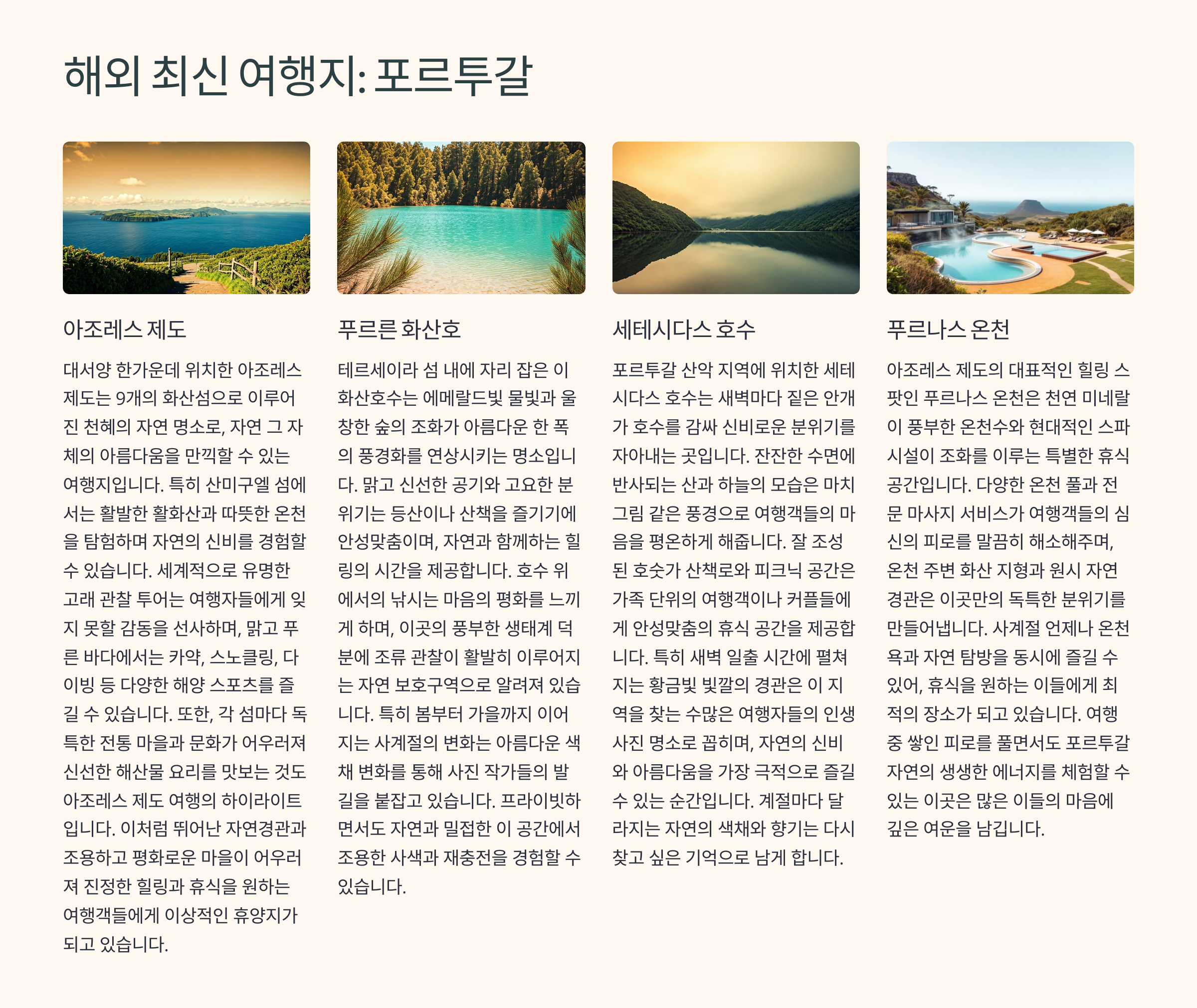 - 추천 코스: 포르투 공항 → 폰타델가다 섬 → 세테시다스 호수 → 푸르나스 온천