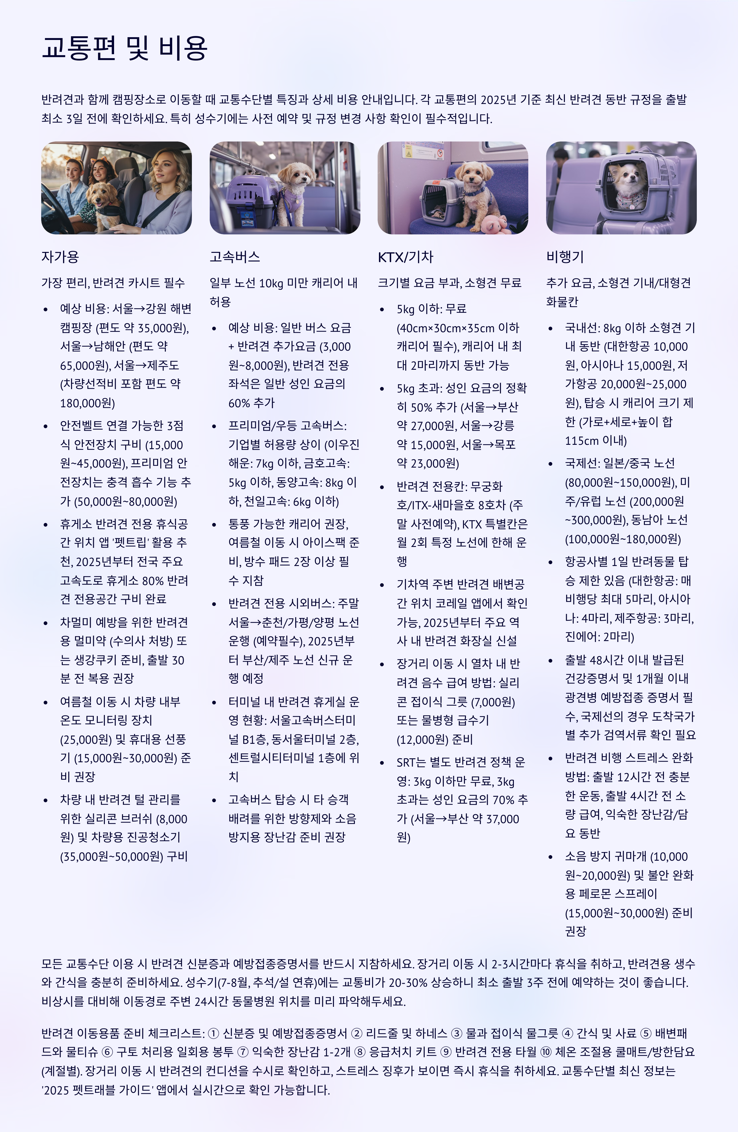 - 비행기: 국내선 기준, 애견 이동 시 추가 요금 발생 (소형견 기내 가능, 대형견 화물칸 이용)