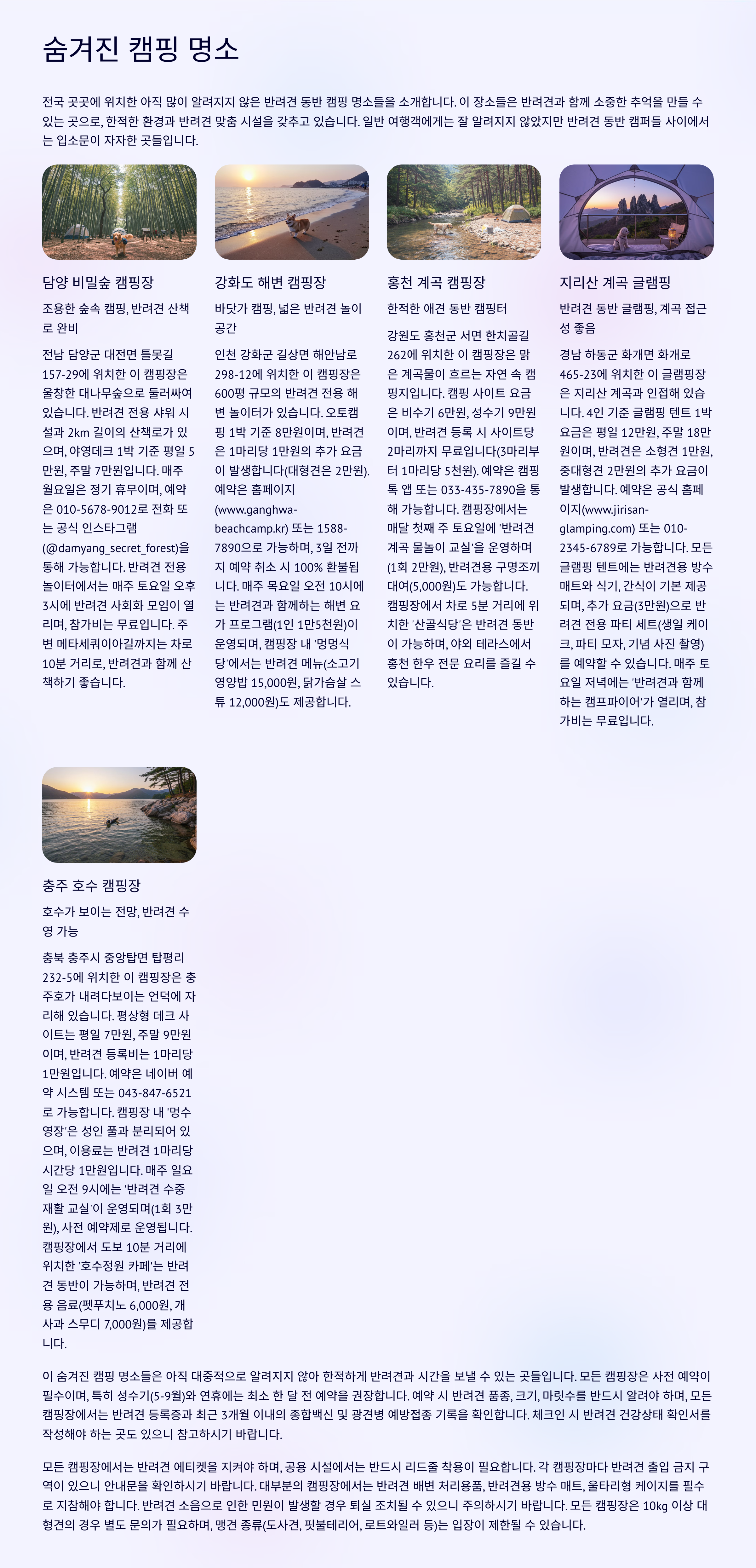 자연 속에서 반려견과 함께 자유롭게 뛰놀며 소중한 추억을 만들 수 있는 '애견 동반 캠핑'이 점점 인기를 끌고 있습니다.